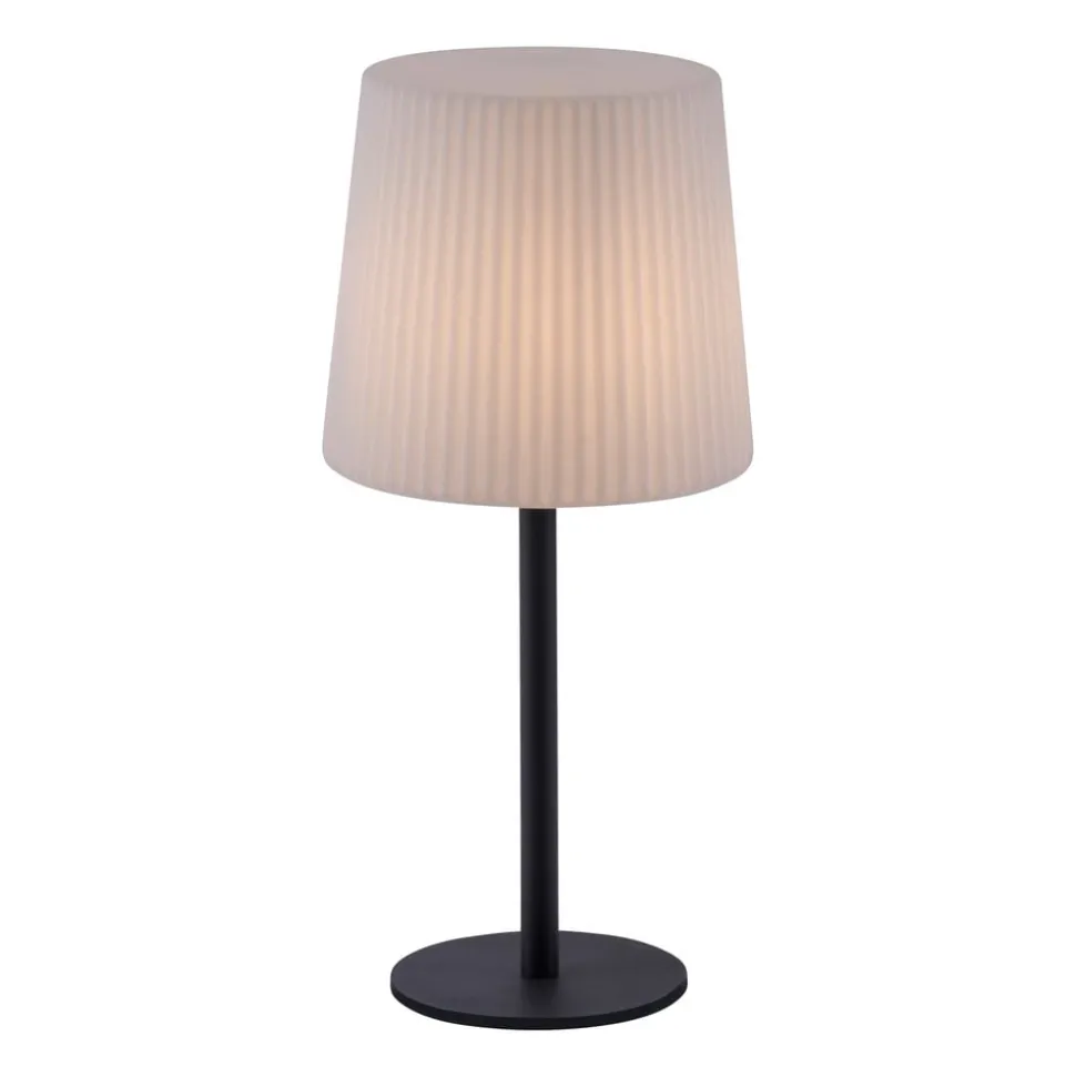Tafellamp Falter met geplooide kap, IP65 De tafellamp Falter kan overal buiten worden gebruikt, omdat hij met beschermingsgraad IP65 optimaal beschermd is tegen weersinvloeden. De tafellamp met een ronde voet en een rechtopstaande steel van antracietkleurig gelakt ijzer is voorzien van een mooie kunststof kap die eruitziet alsof hij geplooid is dankzij het gegroefde patroon rondom. Bij het inschakelen komt het ontwerp van de kap echt tot zijn recht. Het snoer met stekker is 200 cm lang.