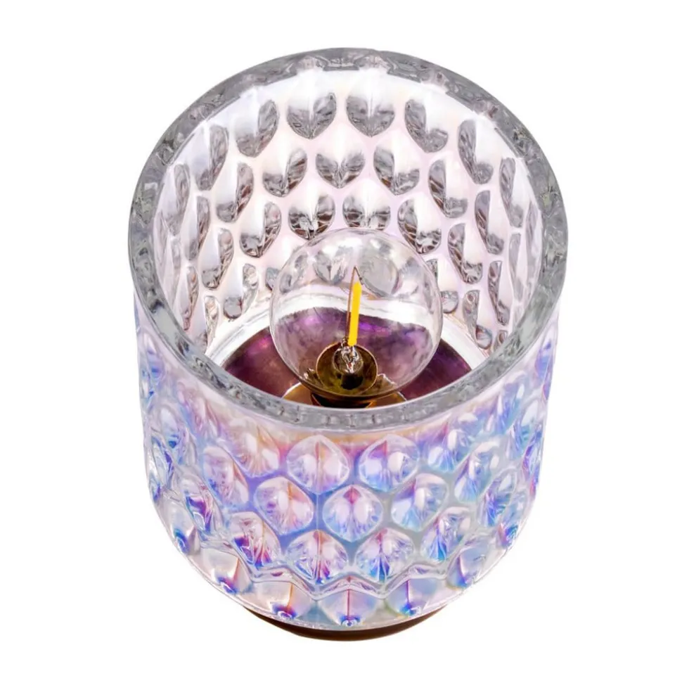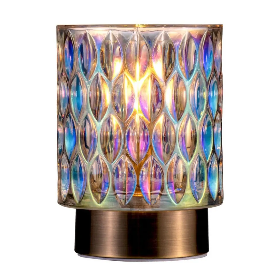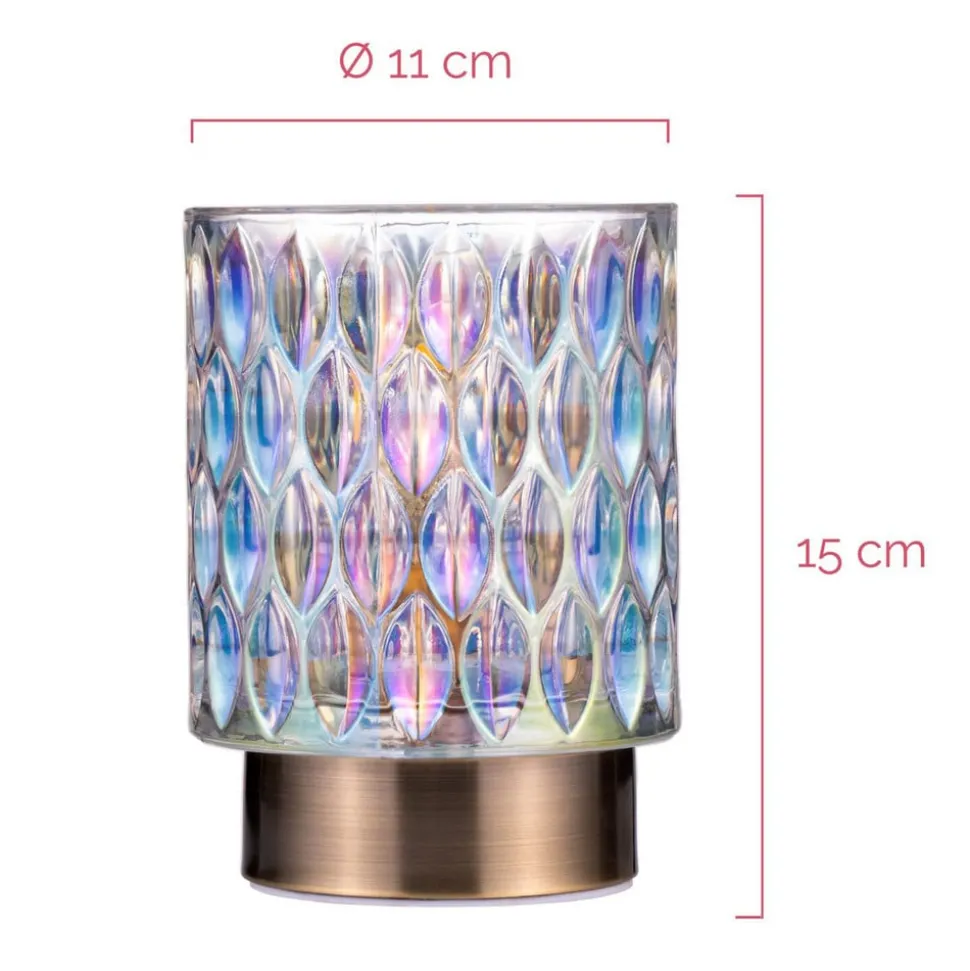 De stijlvolle Clear Glamour LED deco tafellamp bestaat uit een voet van metaal met een geborstelde messing afwerking en een kap van dichroic glas. Dit zorgt ervoor dat het licht in verschillende kleuren schijnt, afhankelijk van de kijkhoek. Een bijpassende LED-lamp is reeds bij de levering inbegrepen.