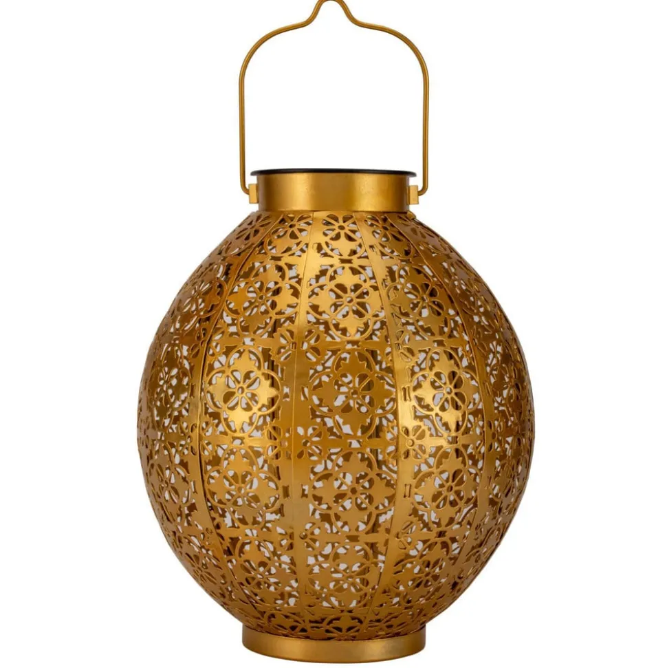 De decoratieve Sunshine Aura solar lantaarn is perfect voor sfeervolle verlichting van zitjes buitenshuis. Het is niet alleen het mooie design van de armatuur in goud dat enthousiasme wekt, maar ook de voordelen die zonnetechnologie met zich meebrengt. Overdag gebruikt de lamp het zonlicht om op te laden en ’s avonds straalt ze tot 8 uur lang haar licht uit (incl. automatische inschakeling). Bovendien is er geen ingewikkelde installatie en bedrading nodig.