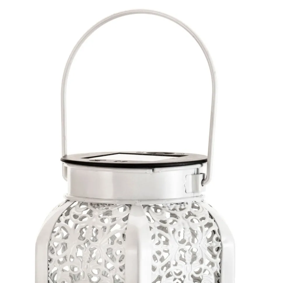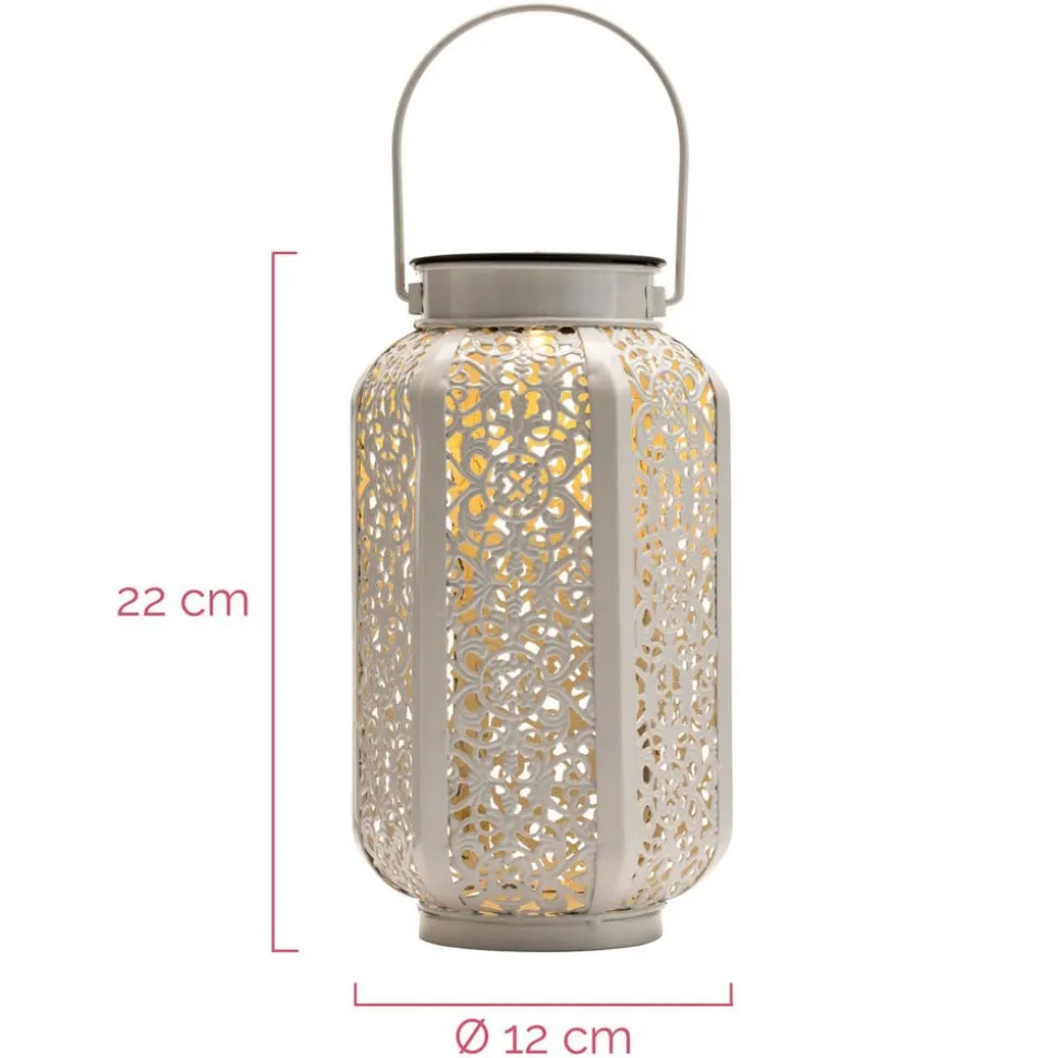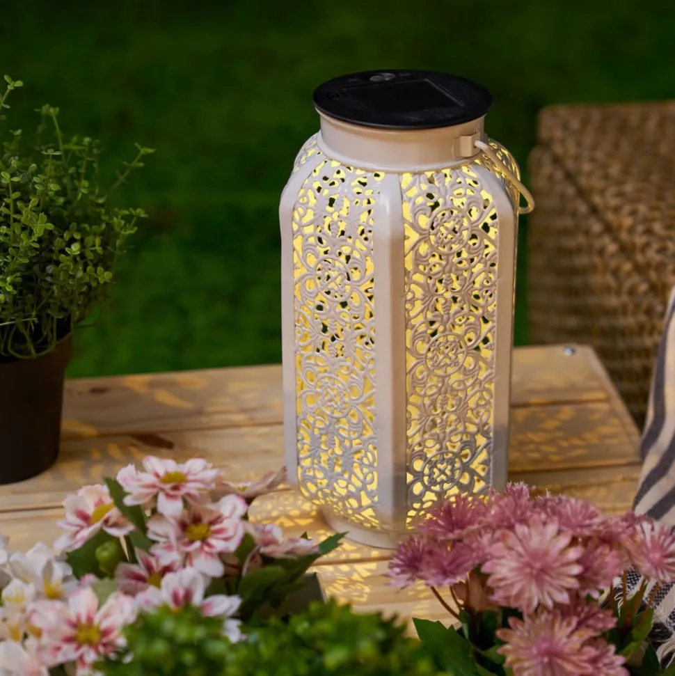 De Sunshine Kiss lantaarn op zonne-energie betovert met zijn witte vintage oppervlak, dat met zijn patroon romantische lichteffecten oproept. De lantaarn wordt overdag in het zonlicht opgeladen en gaat bij het vallen van de avond automatisch aan. De lichtgevende periode is tot 8 uur per dag. De lamp creëert een gezellige sfeer in de buitenruimte. De behuizing is gemaakt van hoogwaardig metaal. Dankzij het handvat kan de zonnelamp bijvoorbeeld ook aan takken worden opgehangen. Voor zonnelichten is geen bevestiging of kabel nodig.