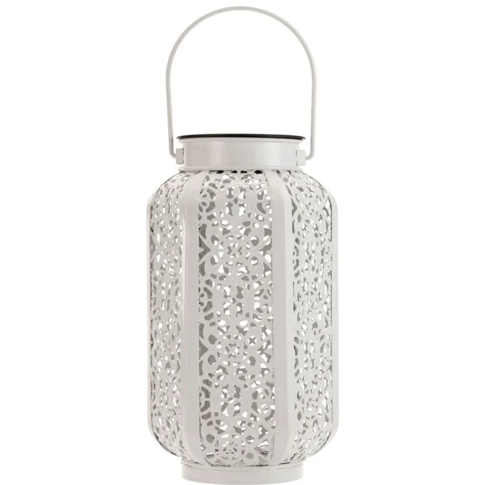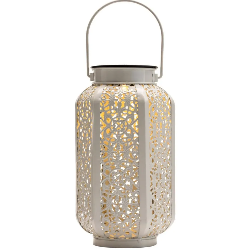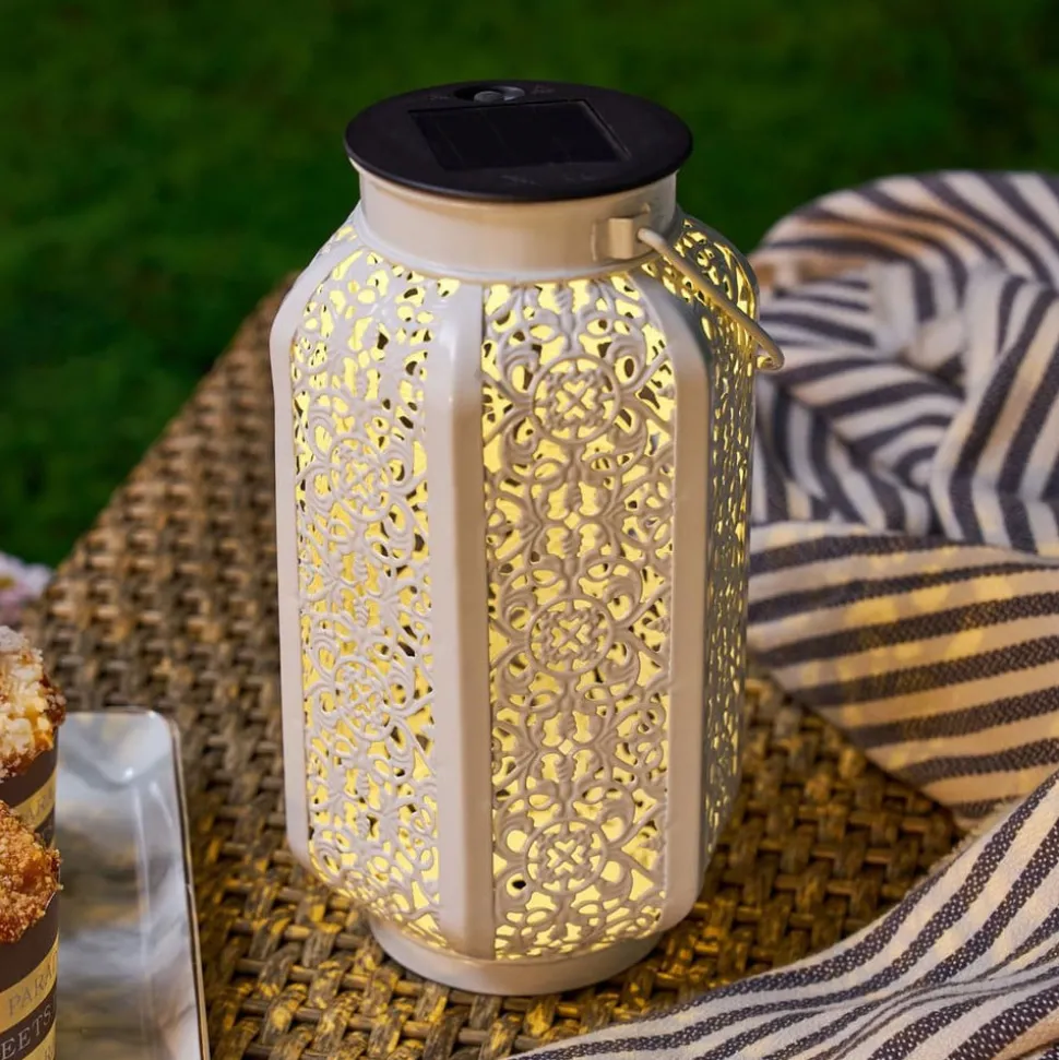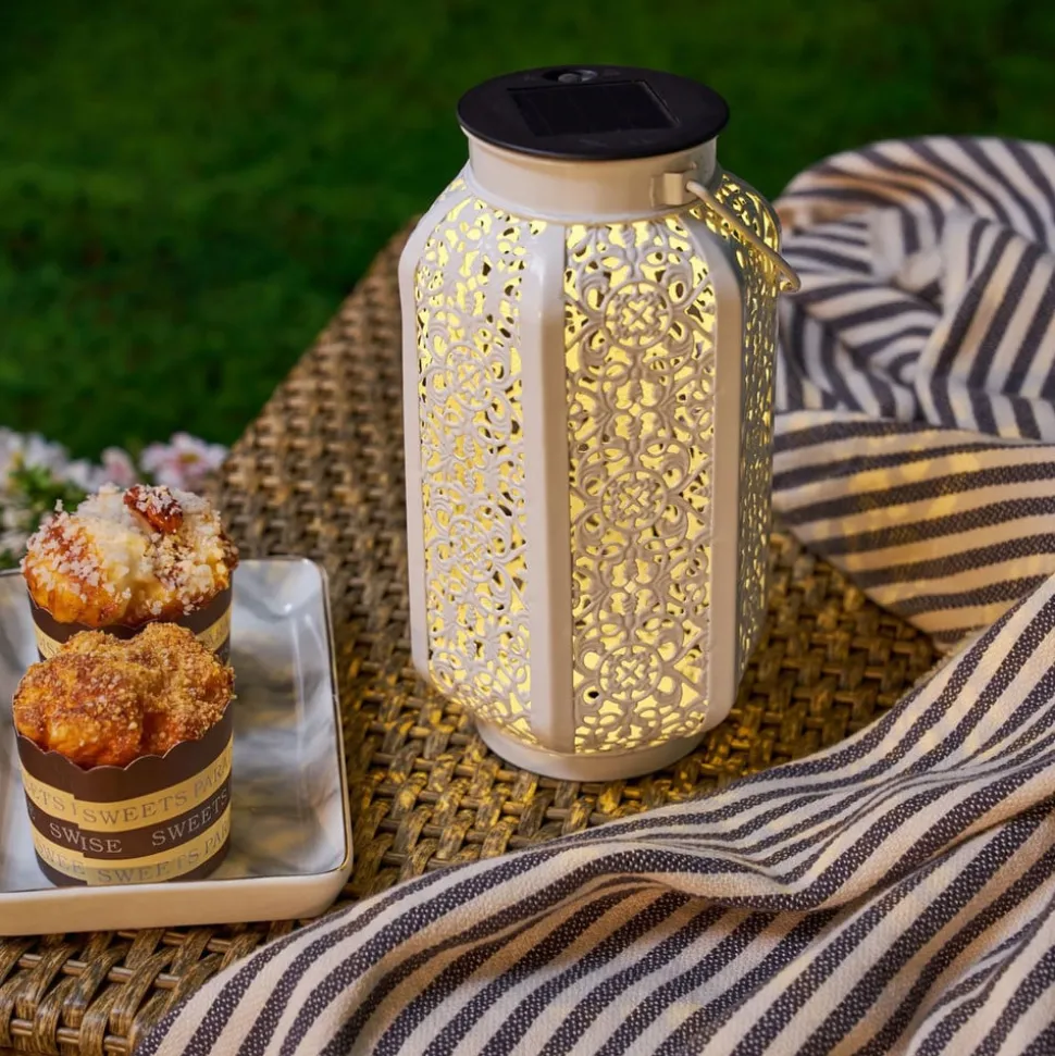 De Sunshine Kiss lantaarn op zonne-energie betovert met zijn witte vintage oppervlak, dat met zijn patroon romantische lichteffecten oproept. De lantaarn wordt overdag in het zonlicht opgeladen en gaat bij het vallen van de avond automatisch aan. De lichtgevende periode is tot 8 uur per dag. De lamp creëert een gezellige sfeer in de buitenruimte. De behuizing is gemaakt van hoogwaardig metaal. Dankzij het handvat kan de zonnelamp bijvoorbeeld ook aan takken worden opgehangen. Voor zonnelichten is geen bevestiging of kabel nodig.