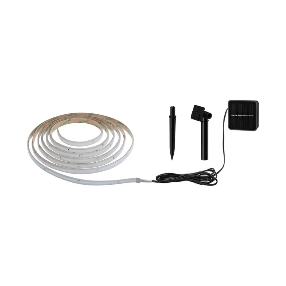 Solar LED strip 78897 met schemersensor, zonnepaneel en Akku De drie meter lange LED strip creëert een gezellige sfeer op het balkon of terras of zelfs in de tuin, ver weg van een stroomaansluiting, want hij wordt gevoed door de zon. Das externe zonnepaneel kan eenvoudig in de grond of in een plantenbak worden gestoken en perfect op de zon worden gericht. De strip kan op de gemarkeerde punten worden ingekort. Hij is voorzien van warmwitte LED’s en de achterkant is zelfklevend voor eenvoudige installatie. Het licht wordt automatisch ingeschakeld bij schemering door de schemersensor. Afhankelijk van de hoeveelheid zonlicht is de oplaadtijd 4 tot 6 uur; als de strip volledig is opgeladen, brandt hij 3 uur.