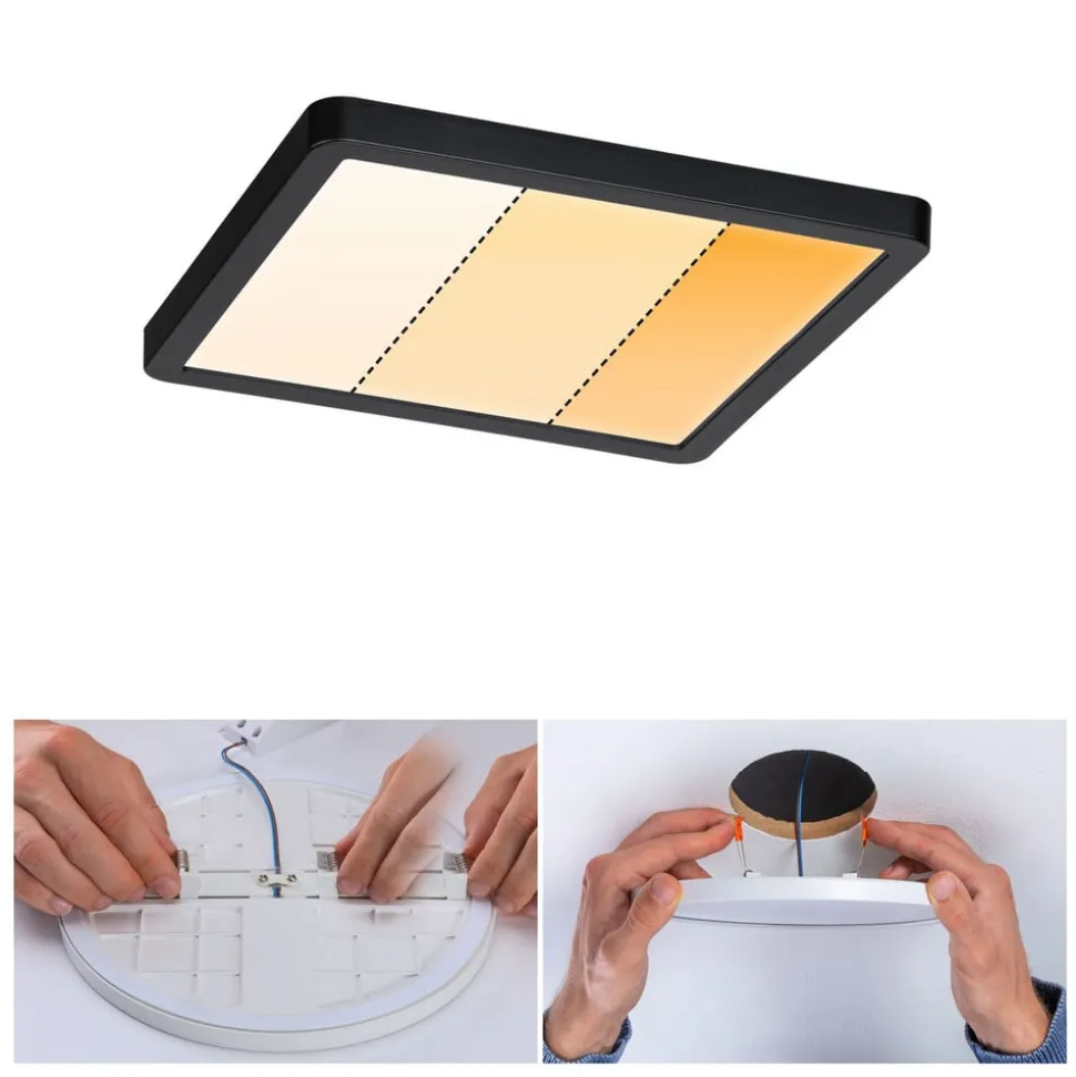 Vierkant, omkaderd Areo LED inbouwpaneel – drievoudige lichtkleurverandering via wandschakelaar Die 3-staps dim-naar-warm technologie maakt het mogelijk om de lichtkleur in te stellen en gelijktijdig te dimmen met alleen de bestaande wandschakelaar, zonder extra accessoires. Deze technologie maakt Das inbouwpaneel bijzonder geschikt voor ruimtes die op verschillende manieren worden gebruikt. Hier kan de praktische werkplek moeiteloos worden gecombineerd met de woon- en ontspanningsruimte, want Areo maakt drie lichtmodi mogelijk, zoals functioneel universeel wit met 100 % helderheid, warmwit met 3.000 K en 50 % helderheid en gezellig warmwit met 2.000 K en 25 % helderheid. Die vlakke inbouwlamp met kunststof frame gaat bijna op in zijn omgeving en oogt ondanks zijn klassieke Form ultramodern en chique – Geschikt voor verschillende inbouwdiameters dankzij verschuifbare veerklemmen aan de achterkant – Kan ook worden gebruikt in vochtige ruimtes zoals badkamers, kelders en buitenruimtes