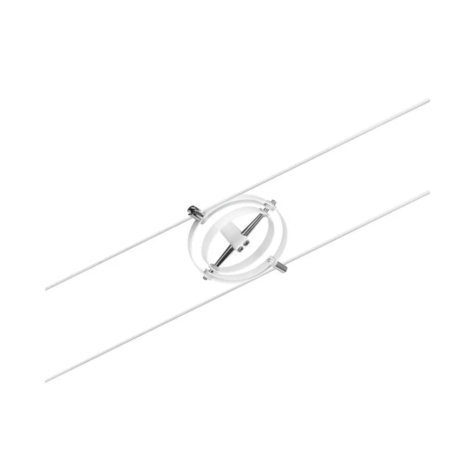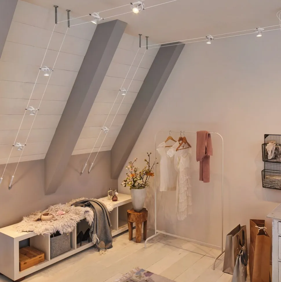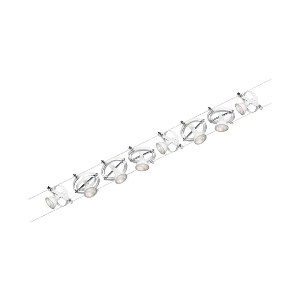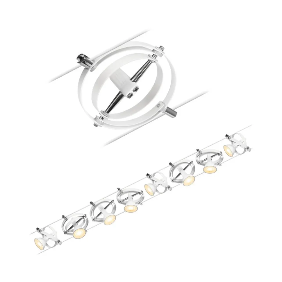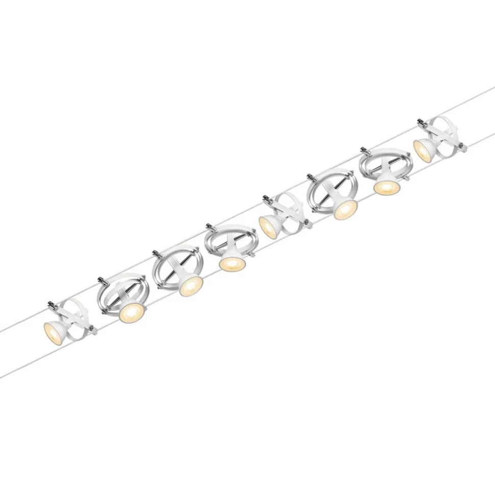 Onbeperkte ontwerpmogelijkheden en een montagemogelijkheid aan het plafond, een schuin dak of aan de muur worden geboden door het Cardan draadsysteem, dat als een complete set wordt geleverd. De acht armaturen zijn elk uitgerust met een GU5.3 fitting, omgeven door twee draaibare ringen van verschillende grootte. De acht armaturen kunnen niet alleen naar wens op de draad worden geplaatst, ze kunnen ook worden gedraaid en gezwenkt, zodat de afzonderlijke armaturen op verschillende plaatsen in de ruimte kunnen worden uitgelijnd en met het draadsysteem kunnen zelfs schuine ruimten of lange gangen perfect worden verlicht. Verlichtingsmiddelen zijn niet inbegrepen.