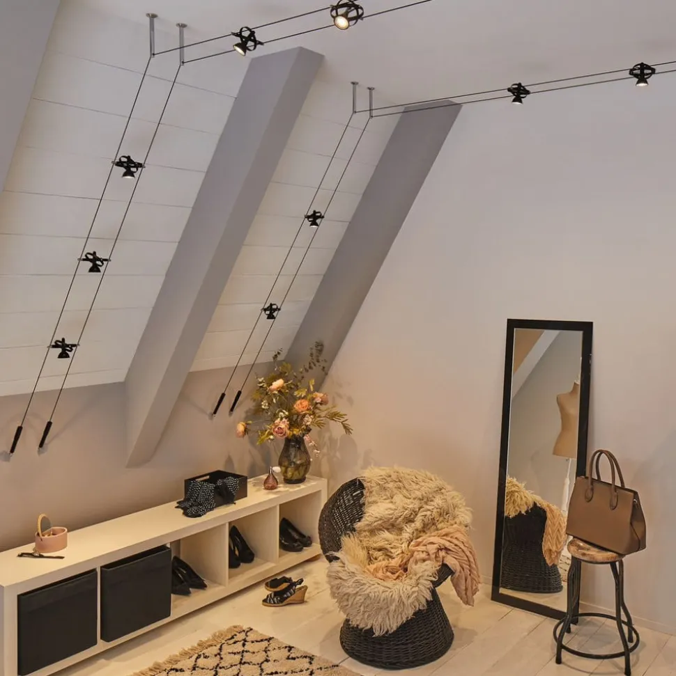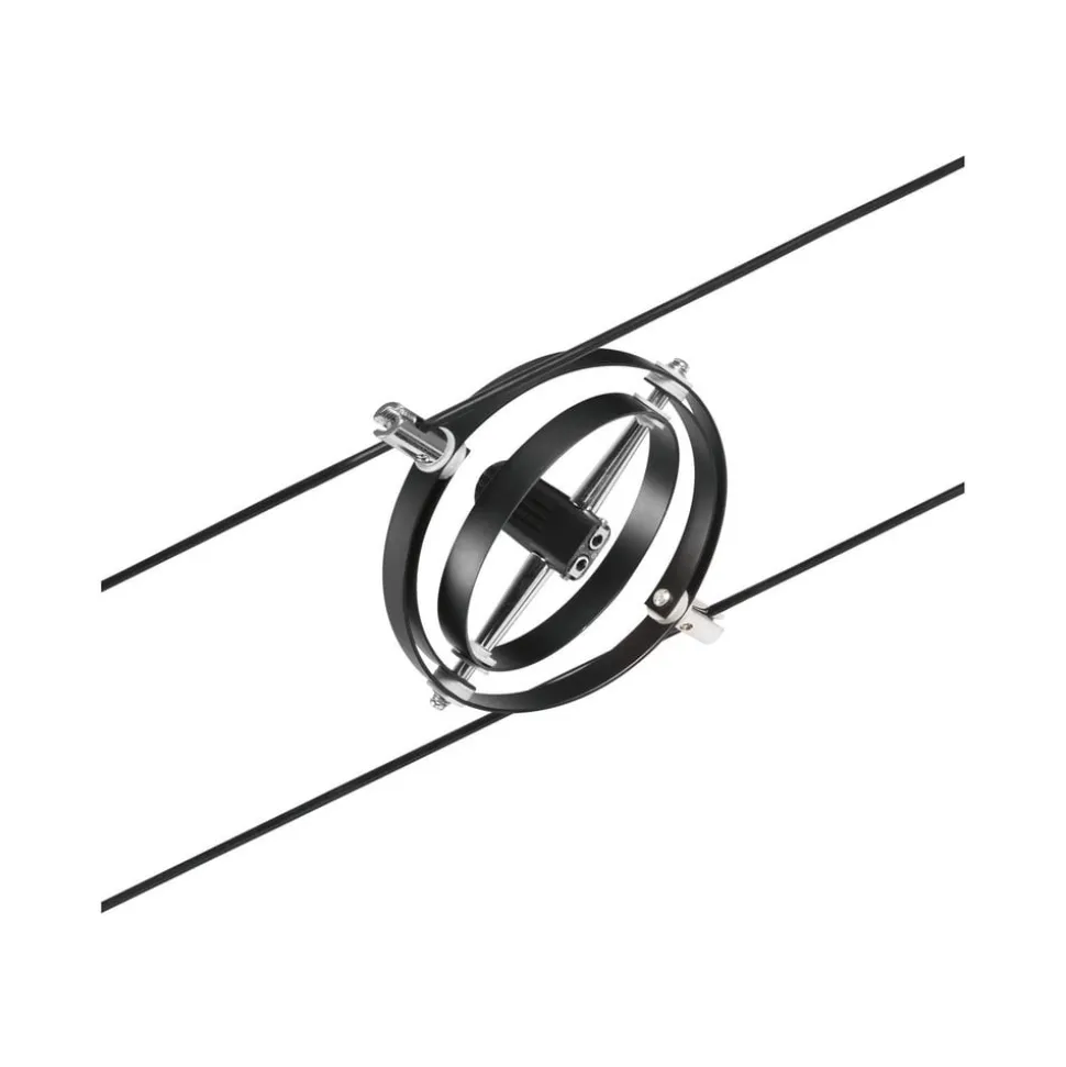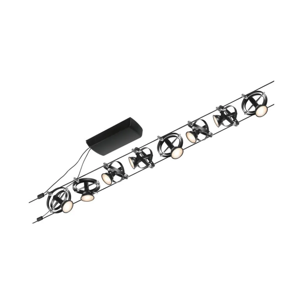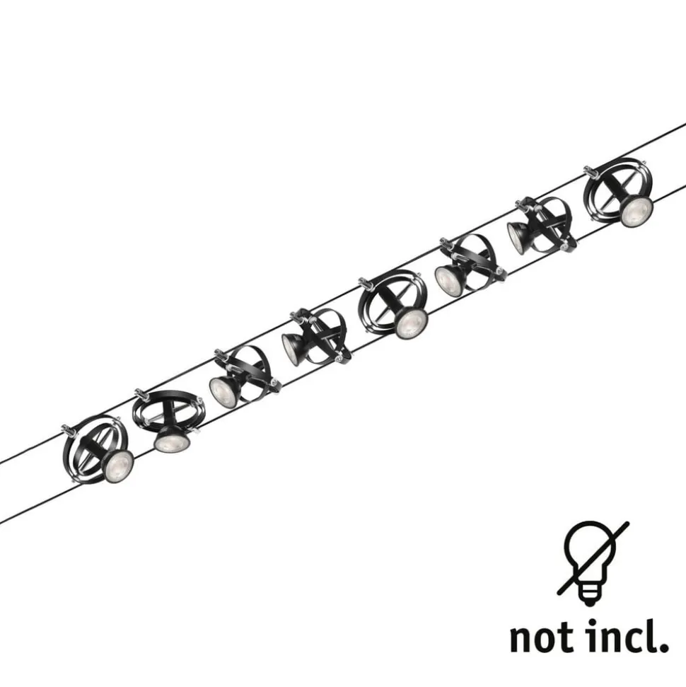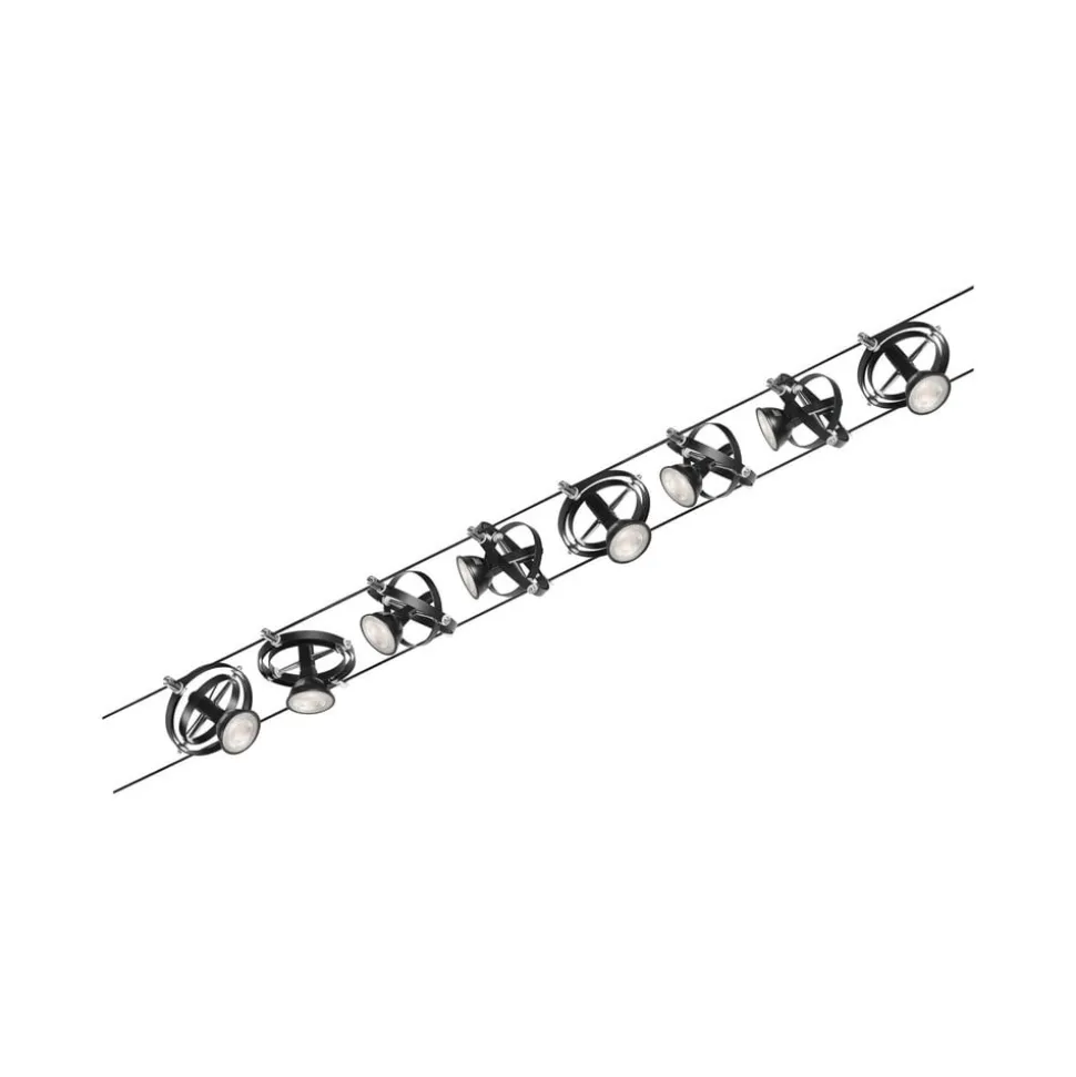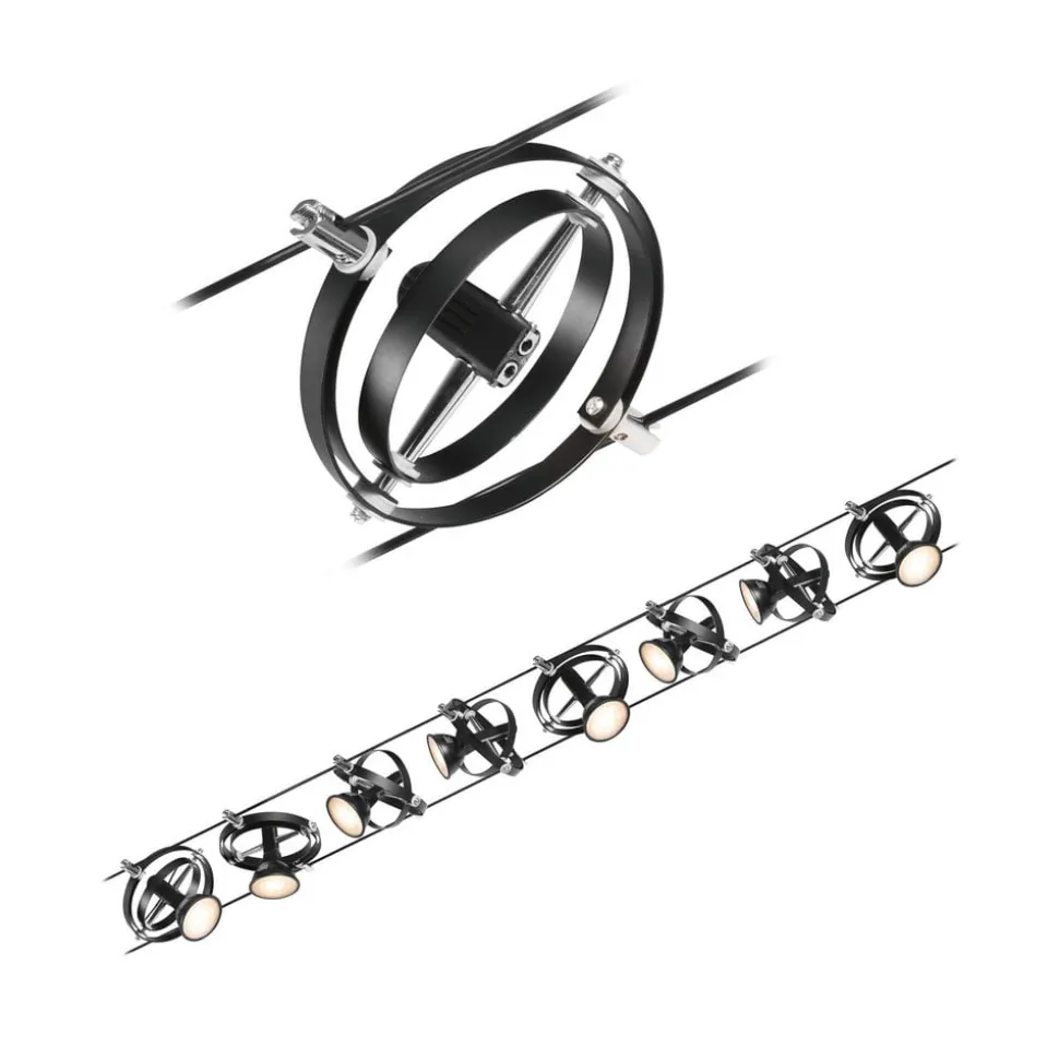 Onbeperkte ontwerpmogelijkheden en een montagemogelijkheid aan het plafond, een schuin dak of aan de muur worden geboden door het Cardan draadsysteem, dat als een complete set wordt geleverd. De acht armaturen zijn elk uitgerust met een GU5.3 fitting, omgeven door twee draaibare ringen van verschillende grootte. De acht armaturen kunnen niet alleen naar wens op de draad worden geplaatst, ze kunnen ook worden gedraaid en gezwenkt, zodat de afzonderlijke armaturen op verschillende plaatsen in de ruimte kunnen worden uitgelijnd en met het draadsysteem kunnen zelfs schuine ruimten of lange gangen perfect worden verlicht. Verlichtingsmiddelen zijn niet inbegrepen.