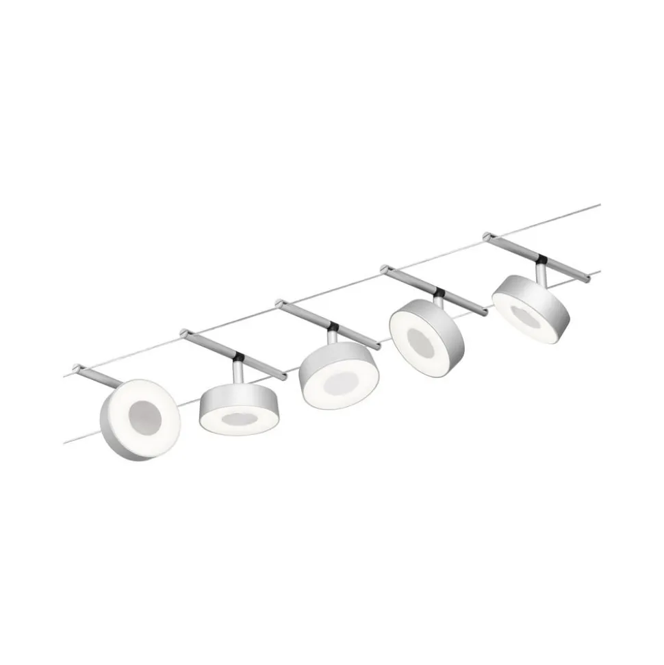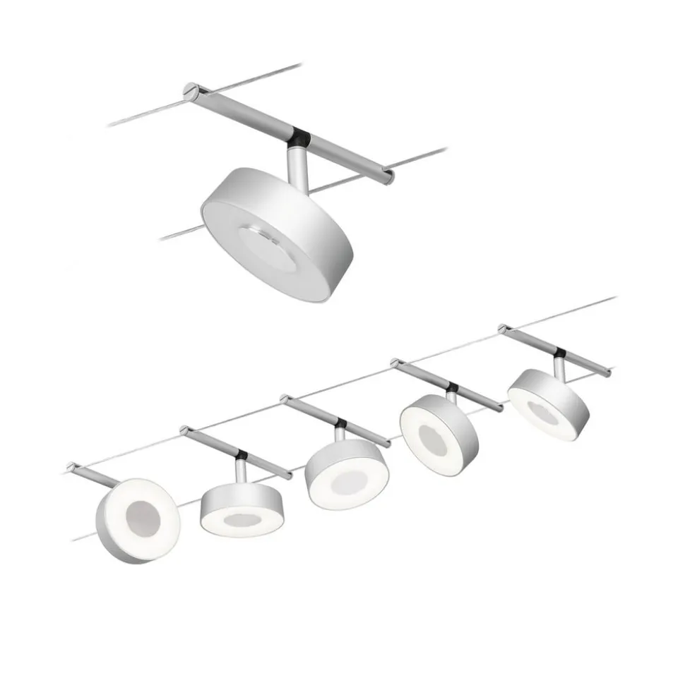 Circle is een LED draadsysteem dat wordt geleverd als een complete set klaar voor aansluiting. Het bestaat uit een draad, een transformator en vijf ronde, platte armatuurkoppen die op de beugels kunnen worden gezwenkt en in elke gewenste stand op de draad kunnen worden geplaatst, zodat zelfs grotere of schuinere ruimten perfect kunnen worden verlicht. Het systeem is zowel geschikt voor plafondmontage als voor montage aan de muur of op het schuine dak. De geïnstalleerde LED’s produceren een warm wit licht en maken van het systeem een energie-efficiënte lichtbron die in vele kamers en inrichtingsstijlen kan worden geïnstalleerd.