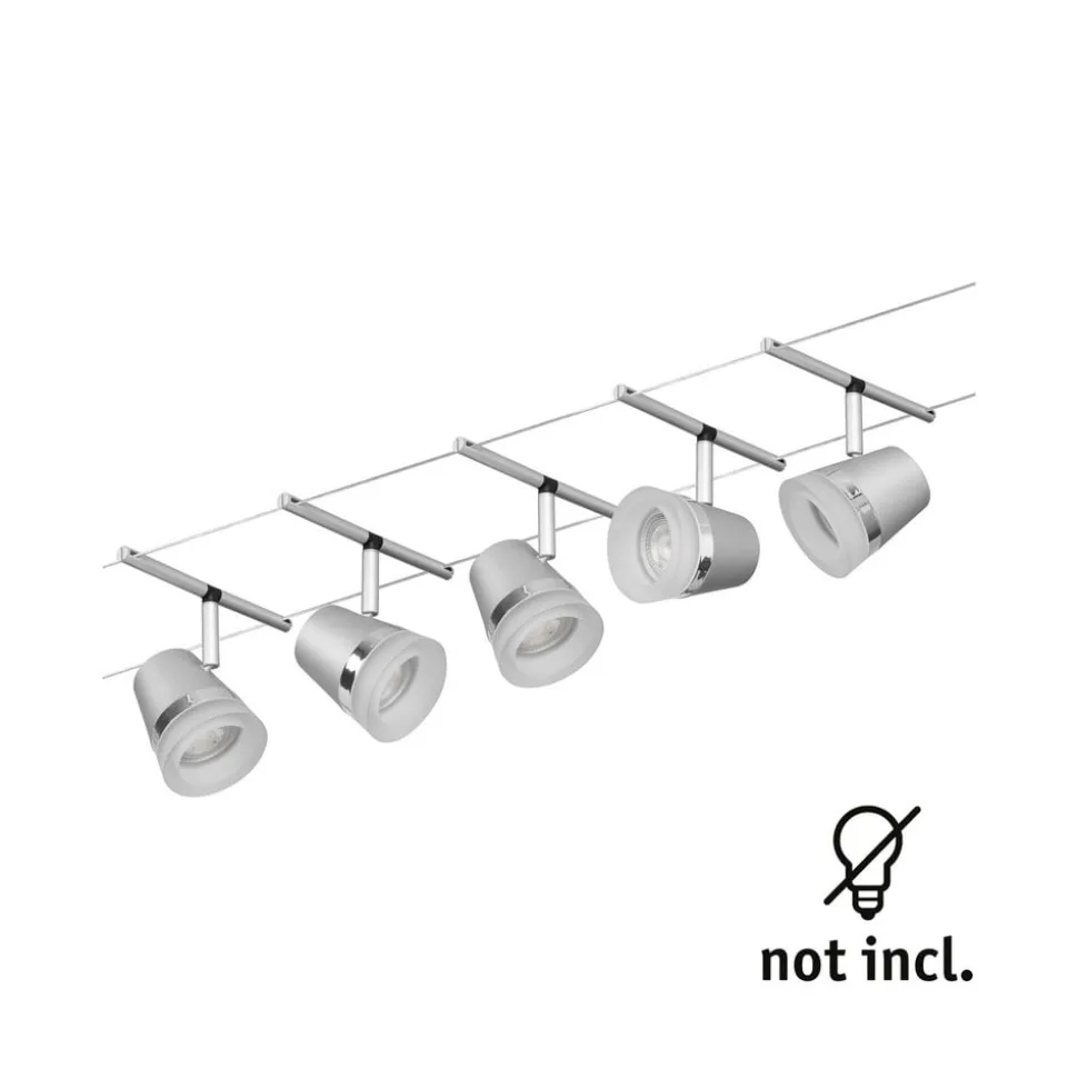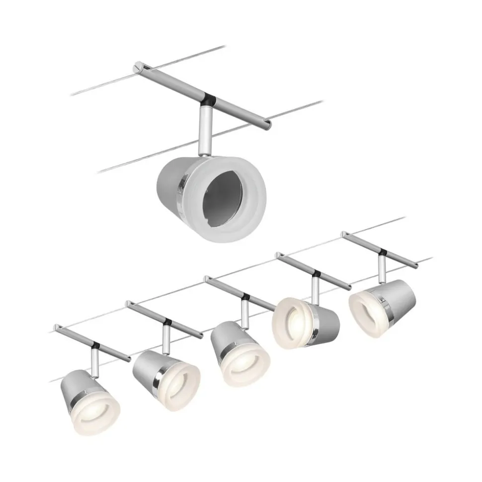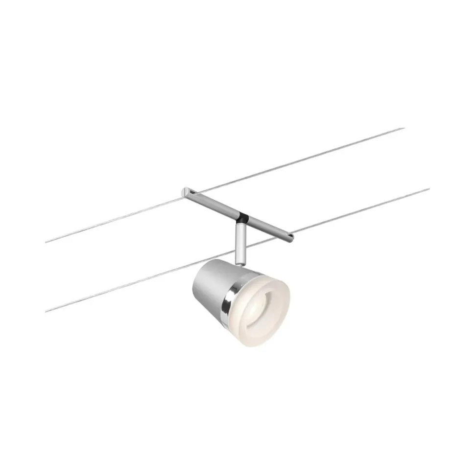 Met het Cone LED draadsysteem kan elke ruimte effectief en vooral flexibel worden verlicht. Of ze nu recht, schuin of in een hoek worden gemonteerd – draadsystemen bieden onbeperkte ontwerpmogelijkheden en passen in elke ruimte. Het systeem bestaat uit de draad, een transformator en vijf armaturen die naar wens langs de draad kunnen worden gerangschikt. Zij hebben een enigszins taps toelopende vorm en zijn afgewerkt met een glanzende sierring en een satijnen ring aan de opening; zij kunnen worden gedraaid en gedraaid zodat hun licht elke hoek van een kamer bereikt en verschillende delen van de kamer of de inrichting gericht kunnen worden verlicht.