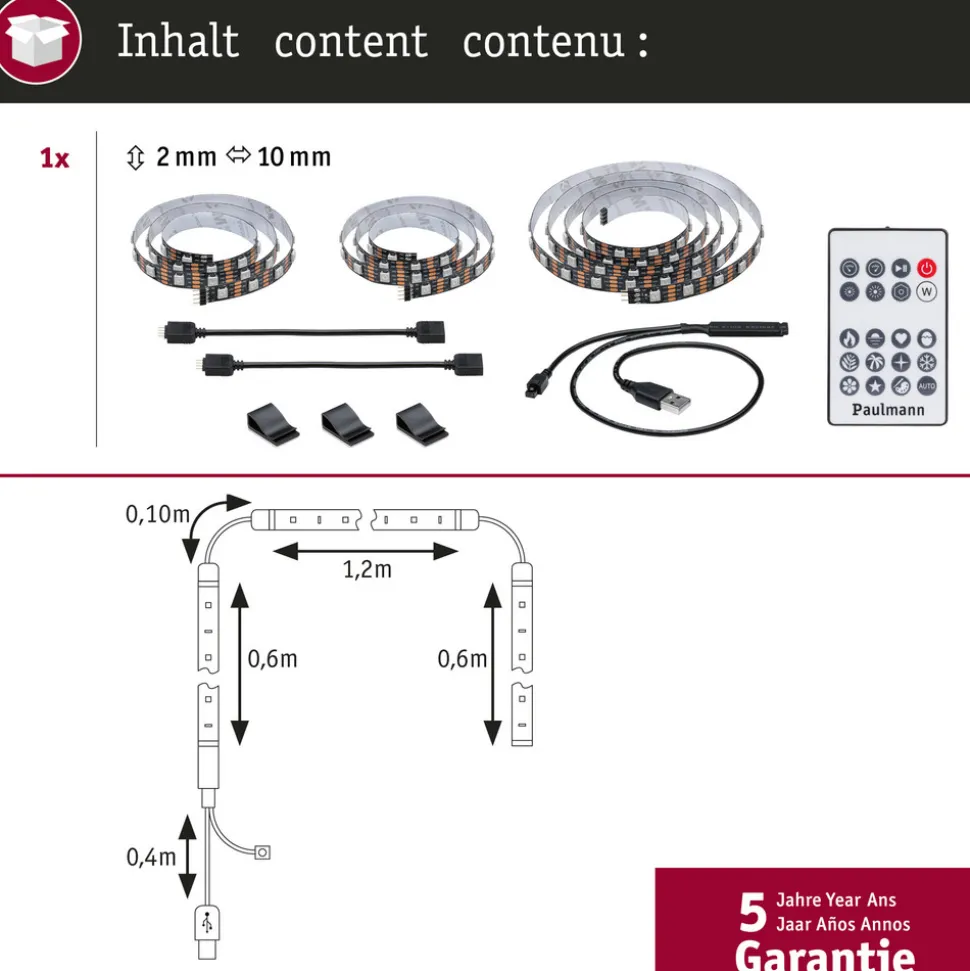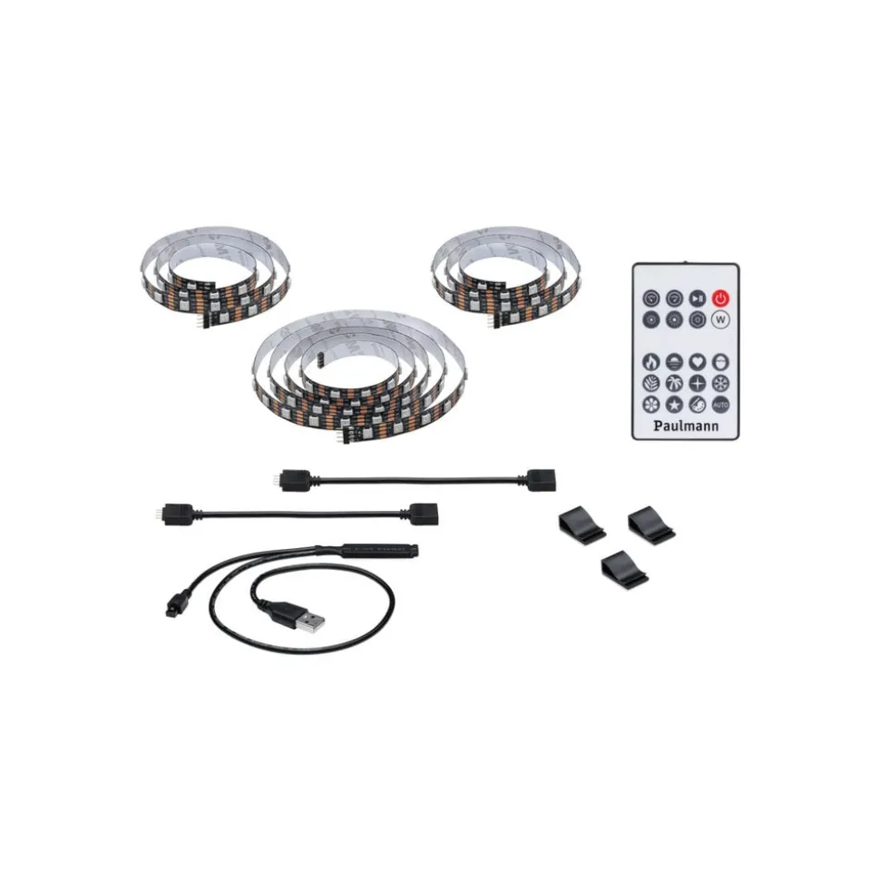 Kleurrijke TV-achtergrondverlichting: EntertainLED LED-stripset voor de TV, USB Spectaculaire lichteffecten in de woonkamer: De USB TV LED-strips van Paulmann voor de TV uit de EntertainLED-serie zorgen voor een driezijdige verlichting achter de TV. Het indirecte sfeerlicht creëert effectieve lichtaccenten met zijn aangename, rustig veranderende en dynamische kleurenspel. Het witte licht kan ook worden ingesteld en de intensiteit kan worden gedimd met de meegeleverde afstandsbediening. De strips zetten vakkundig de scène in de home entertainment- en gamingruimte. De handige bediening via infrarood afstandsbediening maakt het kinderspel om talloze aangepaste kleurverlopen te configureren.Technische kenmerken- TV-achtergrondverlichting voor de TV- Set van drie strips en aansluitingen met afstandsbediening, klaar voor direct gebruik- RGB-kleurwisseling en wit licht- Traploos dimbaar via afstandsbediening- Kan worden bediend via USB- Geheugenfunctie slaat het laatst gebruikte niveau op tot de volgende keer dat het wordt ingeschakeld- Energiebesparende LED-technologie (bespaart tot 80% in vergelijking met conventionele gloeilampen)- Eenvoudig plug-in systeem voor snelle installatie- Kan niet worden verlengd- Kan niet worden gecombineerd met Paulmann YourLED of MaxLED strips