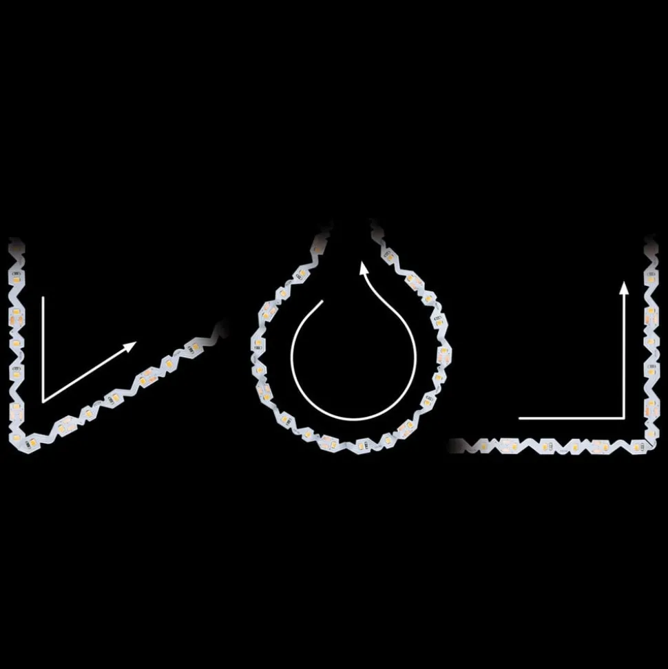 De flexibele stroken van de FlexLED 3D-Set maken door hun unieke ponsen vele installatiemogelijkheden mogelijk en kunnen eenvoudig om hoeken worden gebogen tot een minimum van 60 graden. Ze passen zich ook aan aan driedimensionale randen en rondingen en zorgen zo voor een buitengewoon lichtbeeld. De stroken zijn gemaakt van wit plastic en kunnen worden ingekort bij de markeringen. Ze zijn zelfklevend aan de achterzijde voor eenvoudige montage op meubels en muren. Door het stapsgewijs dimmen van de LED’s ontstaat een geheel eigen lichtscenario.