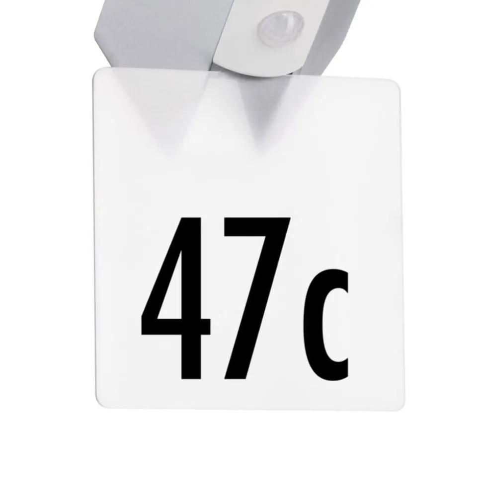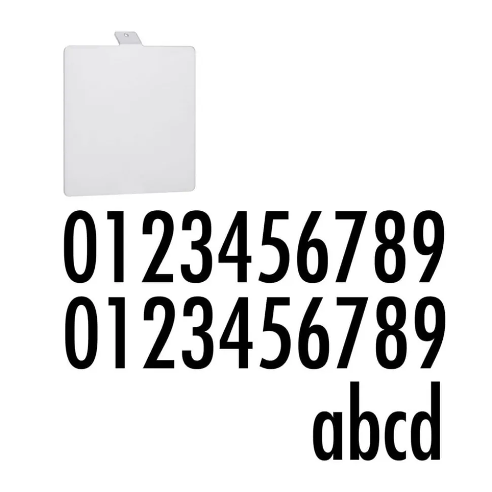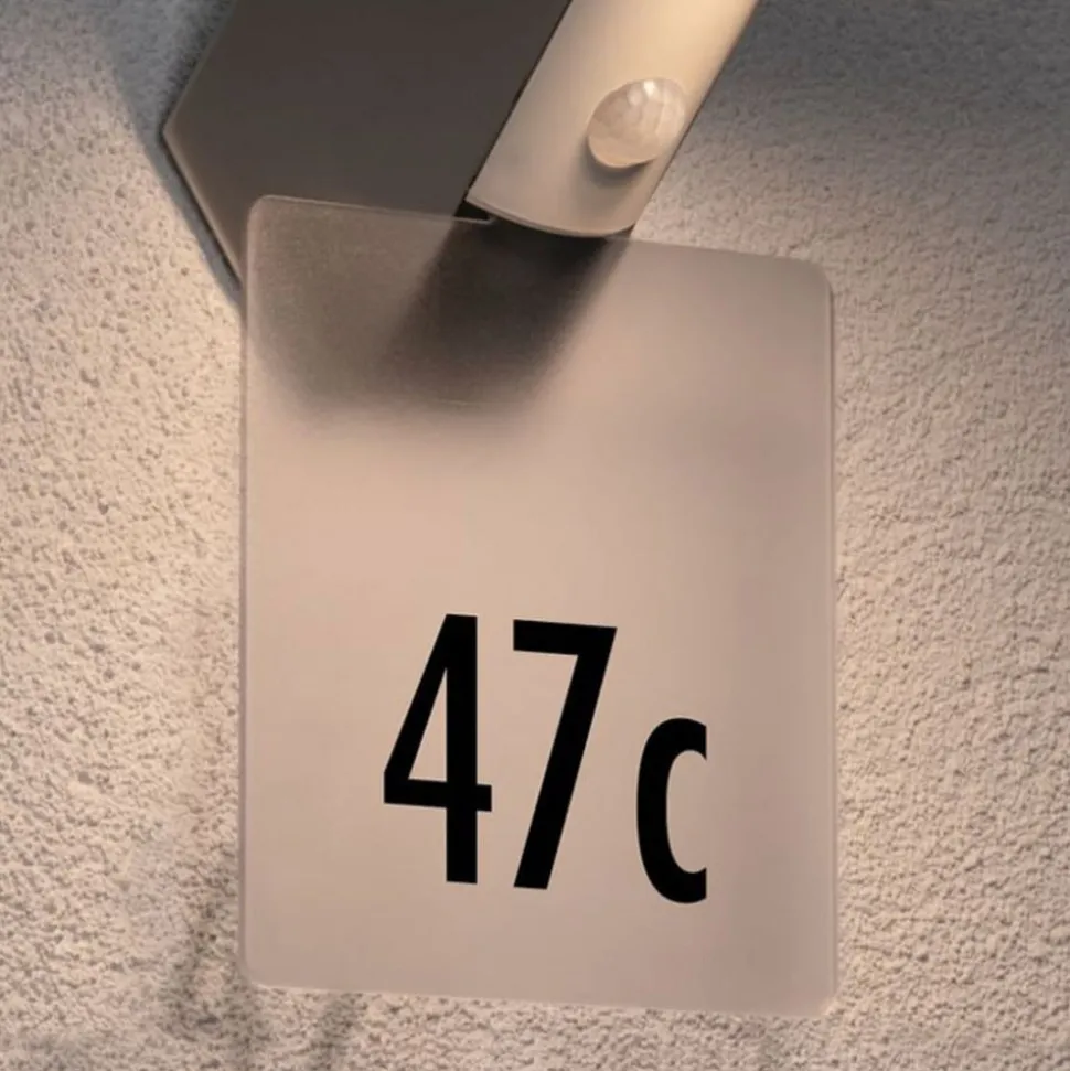 Het huisnummer van de Soley LED-zonnelamp is een eenvoudig, transparant bord in een rechthoekige vorm, dat wordt geleverd met één set letters en twee sets nummers in het zwart voor individuele etikettering.