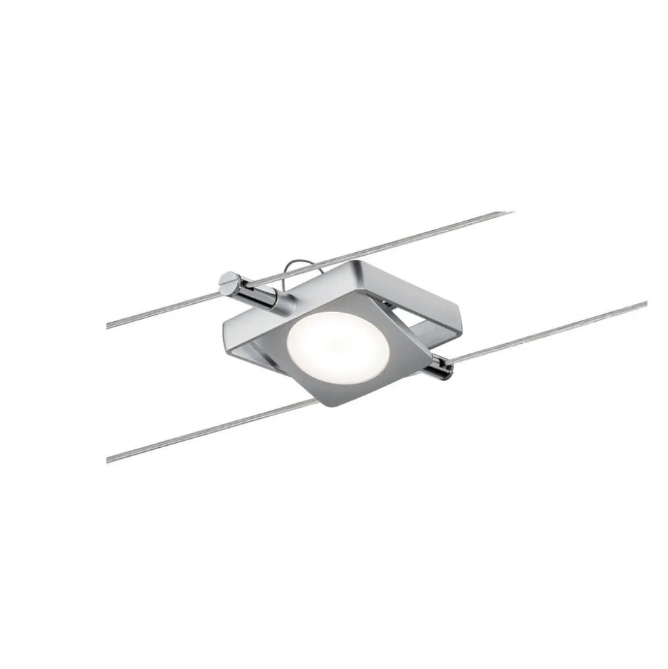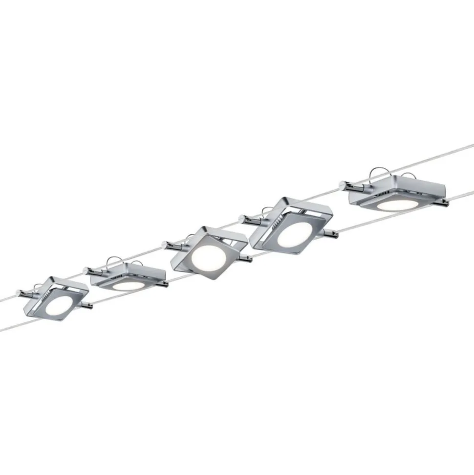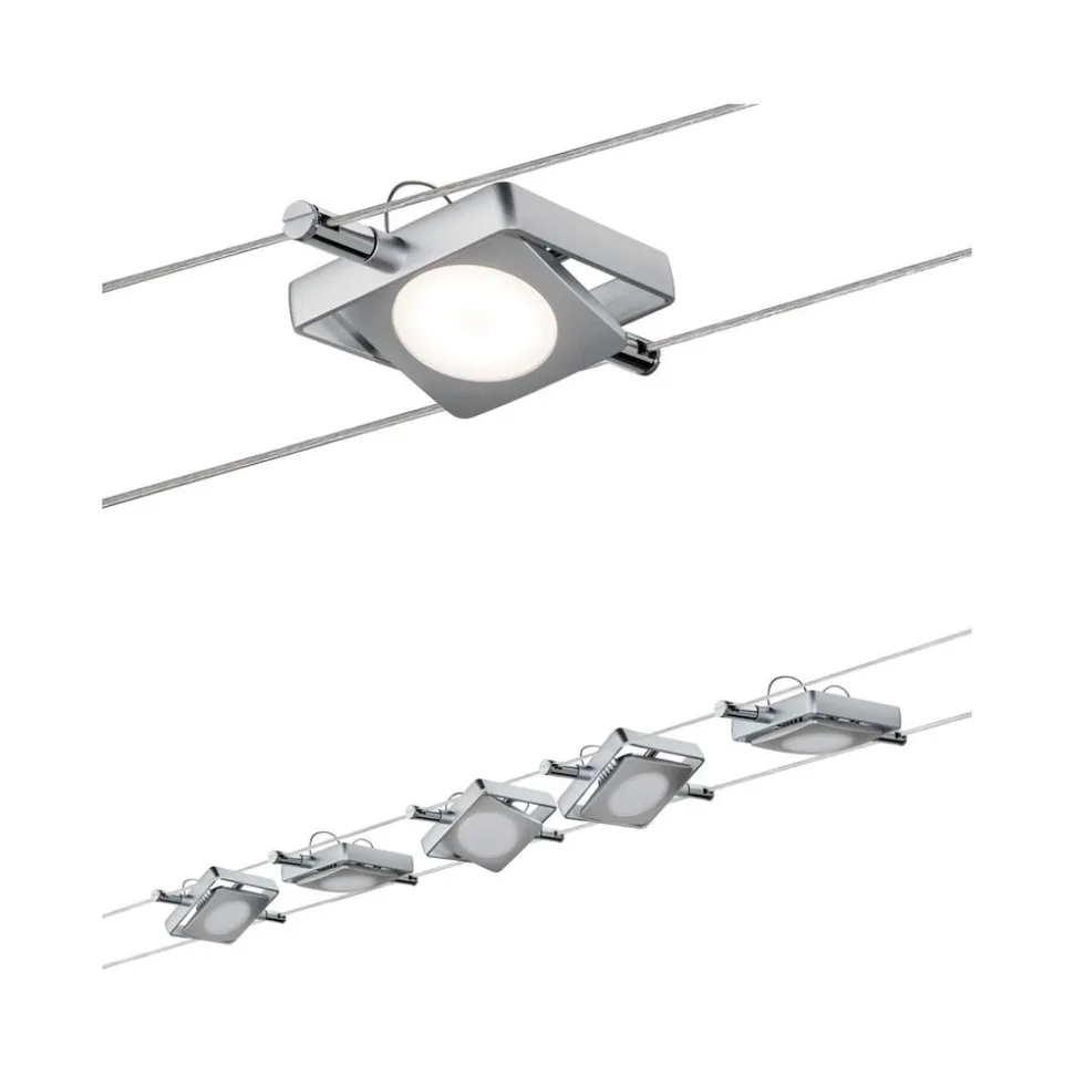 Deze set is een vijfvlammig LED touwsysteem – MacLED met een totaal vermogen van 20 watt. Hij is geschikt voor zowel plafond- als wandmontage en kan worden uitgebreid met talrijke accessoires om een individueel verlichtingsconcept te creëren. Door de uitgebreide, royale lichtverdeling, die op elk moment kan worden beïnvloed door de beweeglijkheid van de spots, is de set ideaal voor algemene ruimteverlichting en kunnen objecten naar wens in scène worden gezet.