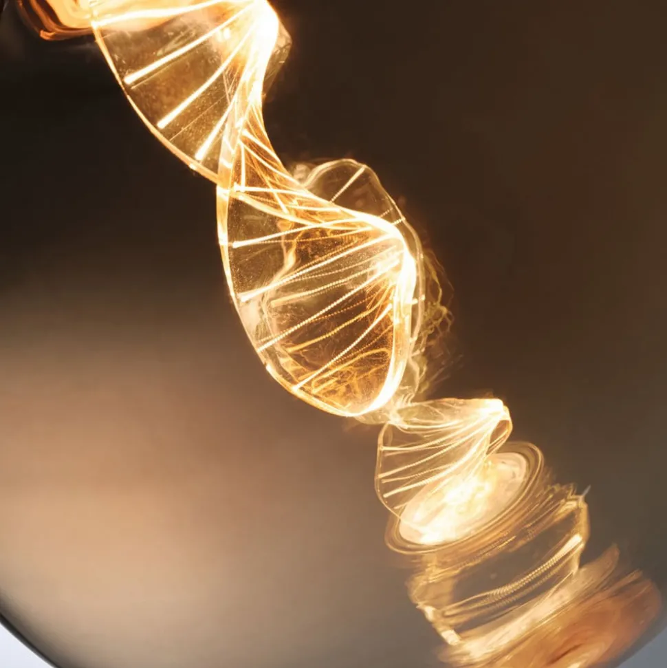 LED globe lamp E27 3,5W Filament Helix 1.800 K, goud getint glas De LED’s in deze LED globe lamp met E27 lampvoet zijn op een heel speciale manier gerangschikt. De decoratieve lamp ziet er geweldig uit in elke fitting zonder kap en geeft absoluut niet-verblindend en zeer gezellig licht dankzij de fijne lasergravure, perfect als decoratieve lamp in de woonkamer. Een deel van het licht wordt direct naar beneden uitgestraald via de verlichte ring aan de onderkant van de lamp – Warm goudkleurig licht 1.800 K – Alleen geschikt voor decoratieve verlichting, niet voor algemene verlichting