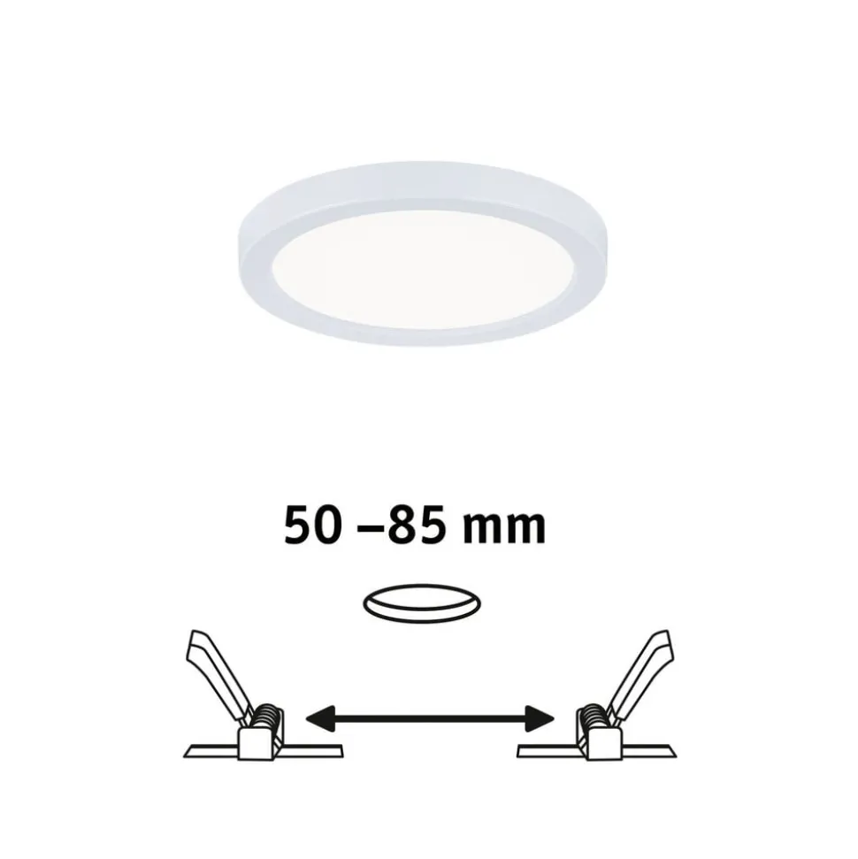 Rond Areo VariFit LED paneel voor plafondinbouw met frame en universeel wit lichtkleur Dankzij de universeel witte lichtkleur is het ronde Areo VariFit LED paneel geschikt voor alle ruimtes waar een koeler licht gewenst is. Das paneel met een decoratief frame van onderhoudsvriendelijke kunststof is ook perfect geschikt voor bestaande inbouwopeningen dankzij de verstelbare klemveren, die traploos kunnen worden ingesteld tussen 50 en 85 mm of 140 mm. Dankzij de beschermingsgraad IP44 kan het paneel ook worden gebruikt in badkamers of andere vochtige ruimtes. Het paneel straalt een brede, gelijkmatige verlichting uit en is ideaal voor sfeerverlichting in ruimtes, als enkelvoudige armatuur of in combinatie met meerdere andere. Het eenvoudige, ronde LED inbouwpaneel is geschikt voor plafond- of wandmontage en past in elk interieur.