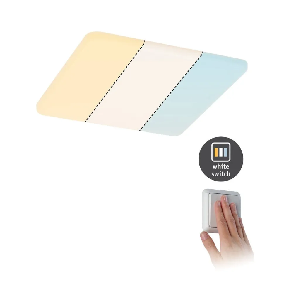 Veluna hoekig LED paneel met lichtkleurwissel regelbaar via de wandschakelaar Veluna is Ideal als multifunctioneel armatuur omdat het de lichtkleuren warm wit, universeel wit en daglicht combineert in één lichtobject. De lichtkleur kan eenvoudig worden gewijzigd via de wandschakelaar door herhaaldelijk schakelen. Veluna is daarom ideaal voor ruimtes die zowel een werkplek als een gezellige leefruimte zijn. Dankzij het eenvoudige design kan de LED inbouwlamp bijzonder goed in vele interieurs worden geïntegreerd en kan ze dankzij de geïntegreerde spatwaterbescherming zelfs in vochtige ruimtes zoals badkamers of kelders worden gebruikt – Geschikt voor inbouwdiameters van 4,5 cm – 10 cm dankzij verschuifbare veerklemmen aan de achterkant – Zeer plat design, gaat bijna op in het montagevlak – Lichtkleuren: warmwit 3.000 K – universeel wit 4.000 K – daglicht 6.500 K – Instelbaar als wand- of plafondinbouwlamp – Gelijkmatig, vlak lichteffect