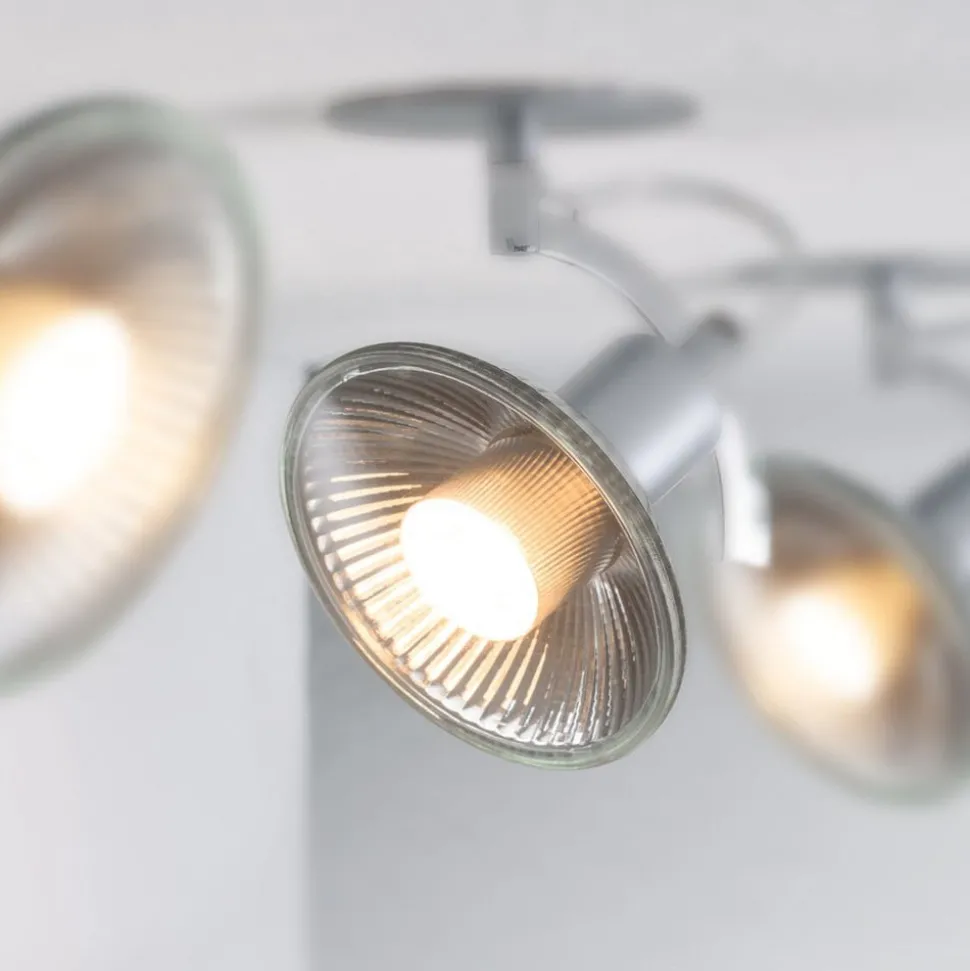 GU10 QPAR 111 LED reflector 4W met warmwitte lichtkleur Deze GU10 QPAR 111 LED reflector met een grote diameter van 111 mm kan worden gebruikt in downlights, spots en spots en straalt warmwit licht uit met een stralingshoek van 24°. De reflectorlamp is daarom perfect voor gerichte verlichting in woonruimtes, maar ook in winkels etc. Technische gegevens/eigenschappen: – Lichtkleur warmwit (2.700 K) – Gerichte verlichting dankzij 24° stralingshoek – Niet dimbaar