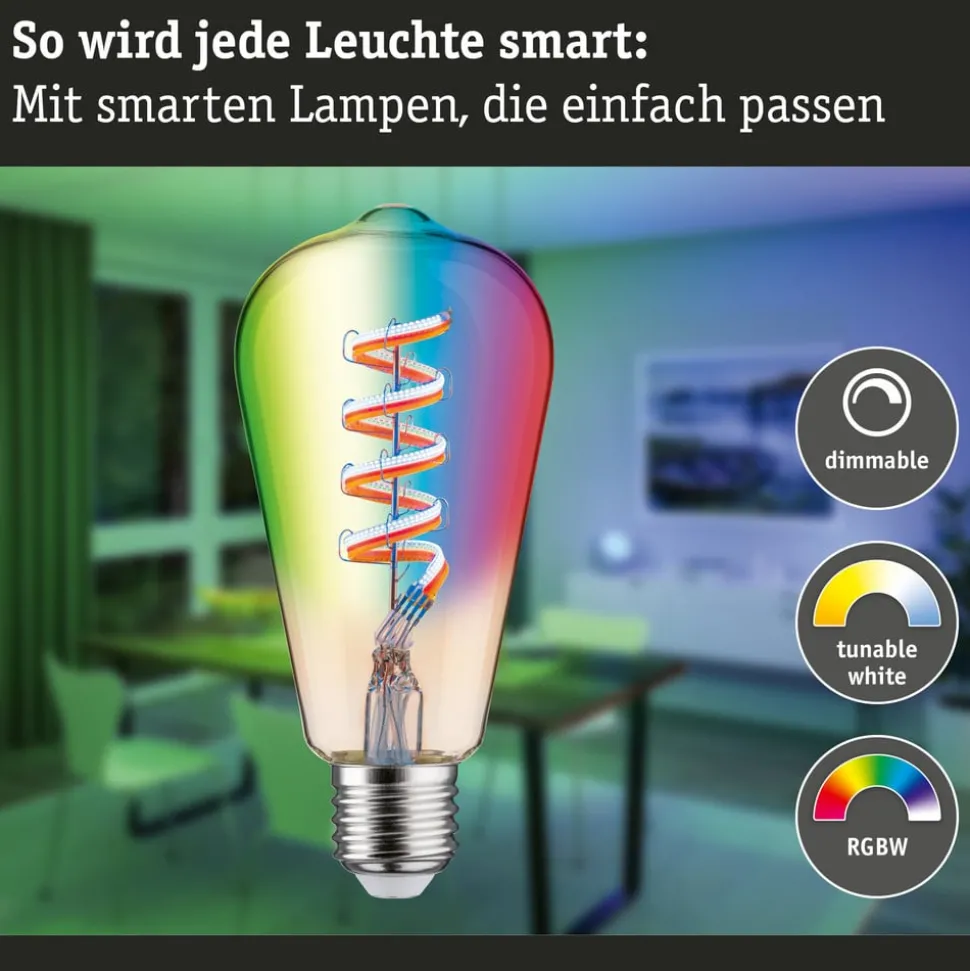 LED rustieke lamp ST64 van Paulmann, E27, RGBW, dimbaar De dimbare, gouden Zigbee 3.0 gloeilamp in een aantrekkelijke rustieke vorm ST64 met getint glas maakt indruk met zijn vintage design en aangename, gelijkmatige licht. De lichtkleur kan worden ingesteld tussen warm wit en daglicht om op elk moment de juiste stemming te creëren. Er zijn ook tal van heldere kleuren om uit te kiezen, zodat niets een feestelijke sfeer in de weg staat. De lichtbron kan individueel of als onderdeel van een groep worden bediend met een app of spraakopdracht via een smart home gateway met een Zigbee-interface. Bediening zonder gateway is mogelijk met een afstandsbediening. Zo kun je op elk moment de juiste lichtsfeer voor je huis selecteren. De lichtbron past in elke standaard E27 fitting – dimbaar