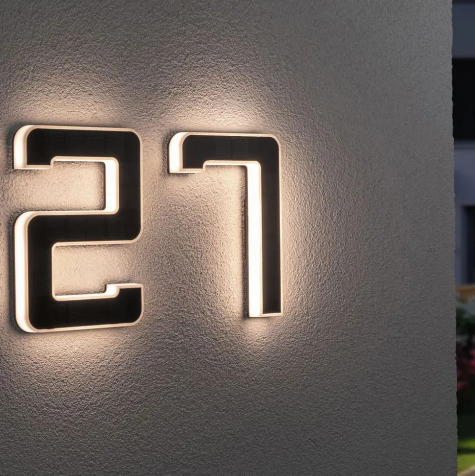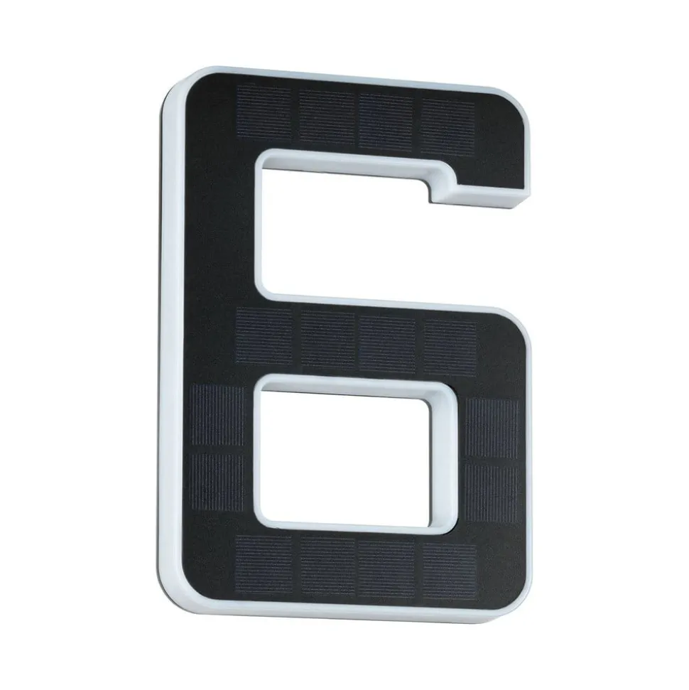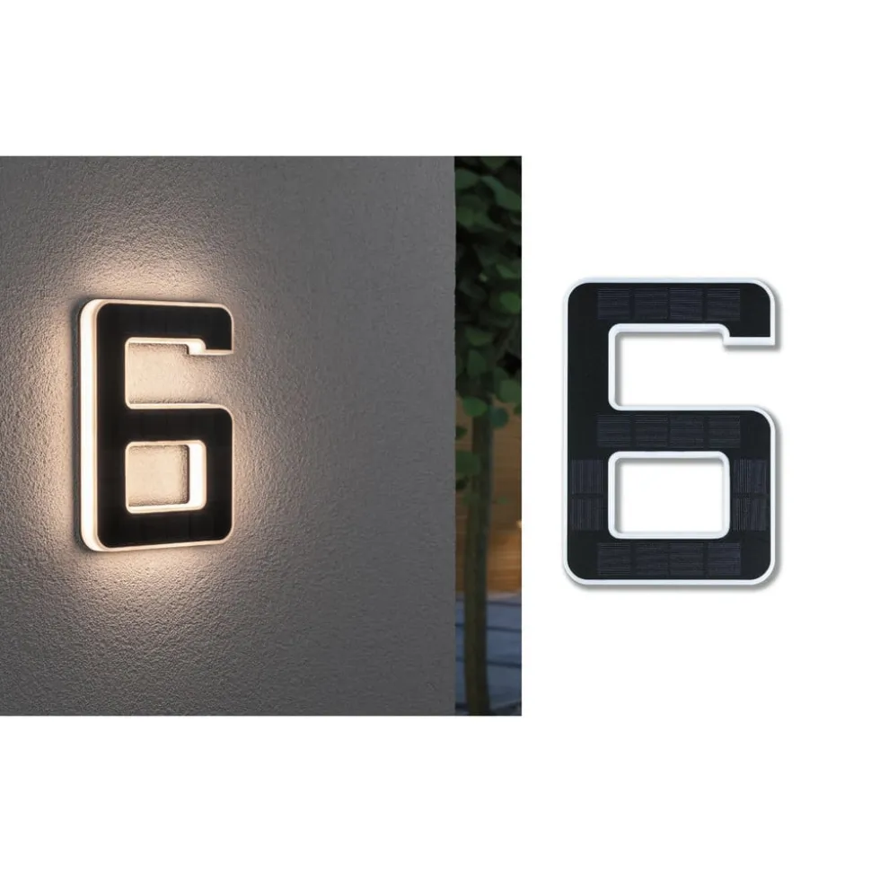 Het huisnummer op zonne-energie is voorzien van een onzichtbaar in het nummer geïntegreerde zonnepaneel dat overdag de geïntegreerde, vervangbare batterij oplaadt, zodat het verlichte huisnummer volledig onafhankelijk van een stroomaansluiting aan de gevel, de huismuur of een andere locatie kan worden bevestigd. Zodra het donker wordt, wordt het huisnummer indirect verlicht door de geïntegreerde, warme witte LEDs. Het licht schijnt zijdelings door de gesatineerde rand van het getal.