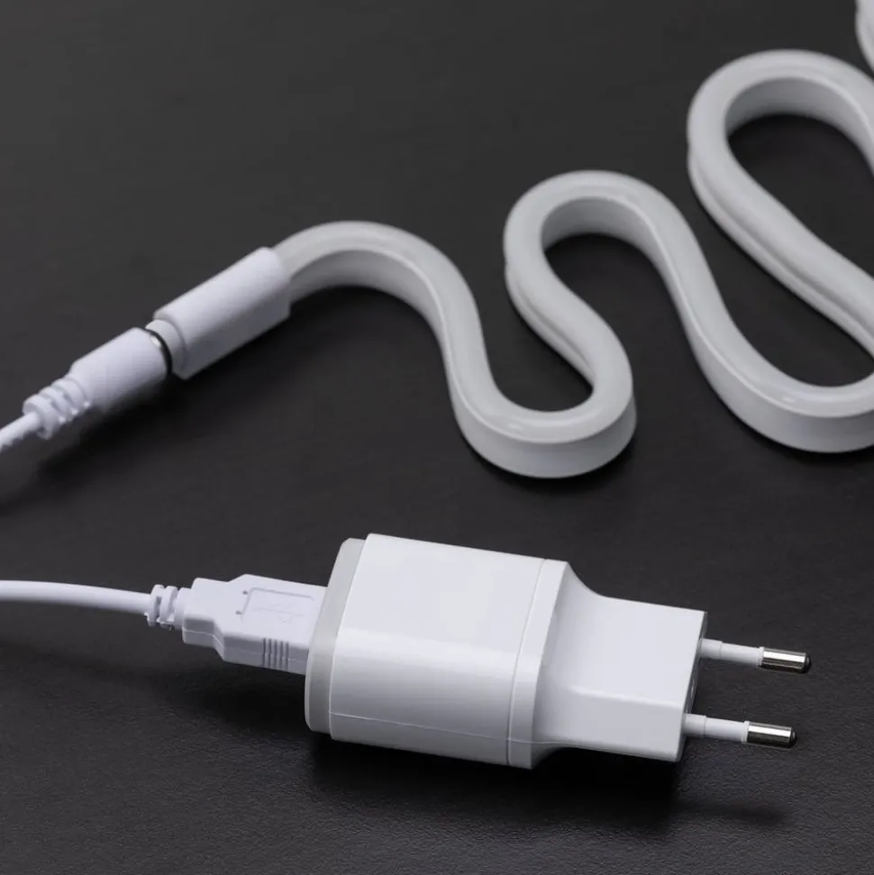 Dankzij de 120 LED’s kan de neonstrip worden gebogen of gevouwen en kan hij dus een grote verscheidenheid aan vormen krijgen. De vorm die met de strook wordt gecreëerd, wordt geaccentueerd met een homogeen neonlichteffect zonder zichtbare lichtpunten. De Strip kan worden aangesloten op een elektriciteitsbank, PC of laptop met de USB-stekker of op een stopcontact met de contactadapter (niet meegeleverd). De strip kan met de meegeleverde transparante bevestigingsclips aan de wand worden bevestigd.