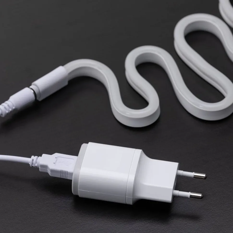 Dankzij de 120 LED’s kan de neonstrip worden gebogen of gevouwen en kan hij dus een grote verscheidenheid aan vormen krijgen. De vorm die met de strook wordt gecreëerd, wordt geaccentueerd met een homogeen neonlichteffect zonder zichtbare lichtpunten. De Strip kan worden aangesloten op een elektriciteitsbank, PC of laptop met de USB-stekker of op een stopcontact met de contactadapter (niet meegeleverd). De strip kan met de meegeleverde transparante bevestigingsclips aan de wand worden bevestigd.