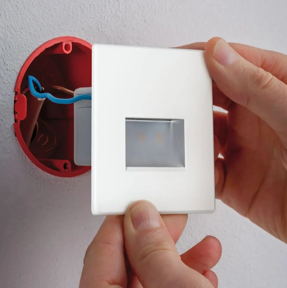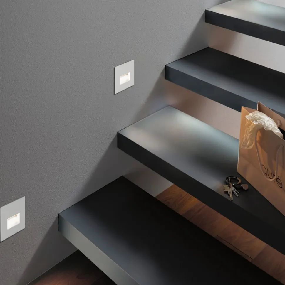 Het licht van de in de vierkante Edge LED inbouw wandarmatuur geïnstalleerde LED’s straalt door de schuin ontworpen lichtuitgang naar beneden, zodat looppaden in de gang of trappen perfect en veilig worden verlicht. De LED wandinbouwarmatuur kan worden geïnstalleerd in standaard inbouwdozen met een diameter van 6 cm. Hiermee kunnen prachtige lichteffecten worden gecreëerd, vooral wanneer meerdere armaturen in één wand worden geïnstalleerd voor trap- of gangverlichting.