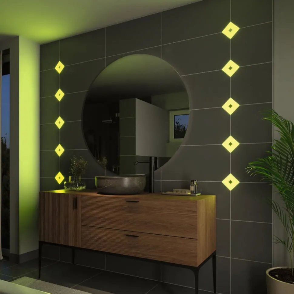 set van 5 voor inbouw in een tegelspiegel: LumiTiles Square LED tegels met transformator en ZigBee controller, RGBW kleurregeling, IP44Bij deze set van 5 LumiTiles Square LED inbouw wandlampen zijn zowel een transformator als een op ZigBee gebaseerde RGBW controller inbegrepen. Dankzij hun klassieke afmetingen (10 x 10 cm) en de geringe inbouwhoogte van 10 mm kunnen de LED tegels gemakkelijk in een tegelspiegel in de badkamer of keuken worden geplaatst. Ze zijn beschermd tegen spatwater met de beschermingsgraad IP44.Van thuis uit kunnen de LumiTiles via de conventionele wandschakelaar worden in- en uitgeschakeld. Voor het dimmen van de intensiteit en het veranderen van de lichtkleur zijn drie opties beschikbaar – warm wit licht (2.700 K) en meer dan 16 miljoen gekleurde lichtkleuren. Ook de LumiTiles Square Touch module (zie accessoires) kan in de tegelspiegel worden geïntegreerd en via aanraking worden bediend, maar ook met de Gent-afstandsbediening van Paulmann. Voor nog meer mogelijkheden gebruikt u in plaats daarvan de smik gateway van Paulmann, die bediening via een gratis app mogelijk maakt. Beide opties kunnen afzonderlijk worden aangeschaft via de accessoires.Bij integratie met behulp van de gateway kunnen alle functies ook via spraakopdrachten (Amazon Alexa of Google Assistant) worden bediend. Bovendien kunnen timers worden ingesteld voor tijdgestuurd schakelen en kunnen vooraf gedefinieerde lichtscènes worden opgeroepen.Technische kenmerken / compatibiliteit- warm wit licht (2.700 K) en meer dan 16 miljoen kleurrijke lichtkleuren kunnen worden ingesteld- traploos dimbaar- ZigBee 3.0 compatibel- radiofrequentie: 2,4 GHz- radiobereik: 25 m- kan worden geïntegreerd in tegelspiegels dankzij de geringe inbouwdiepte (10 mm)- beschermd tegen spatwater (IP44)- eenvoudig aan te sluiten dankzij Plug