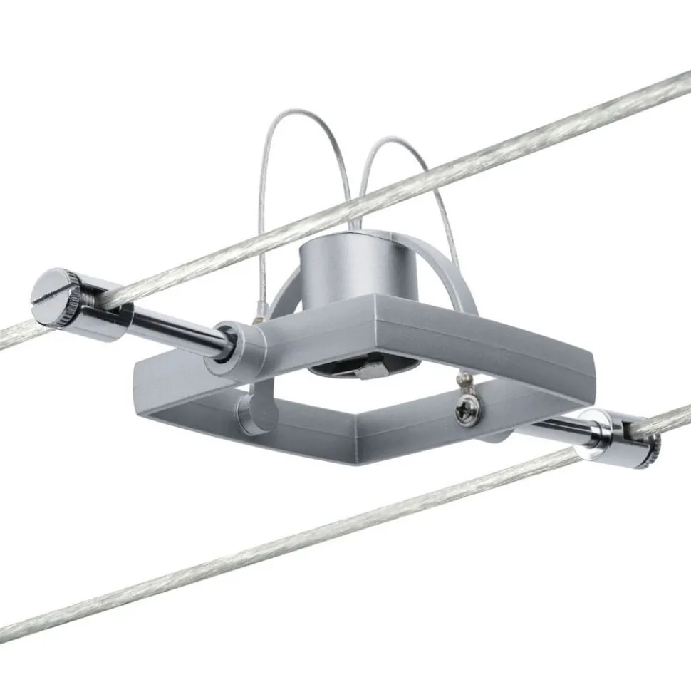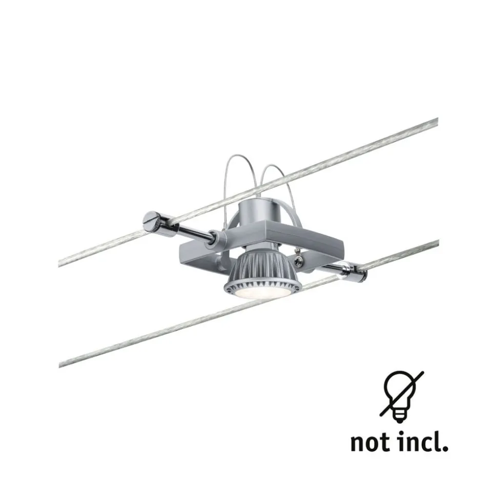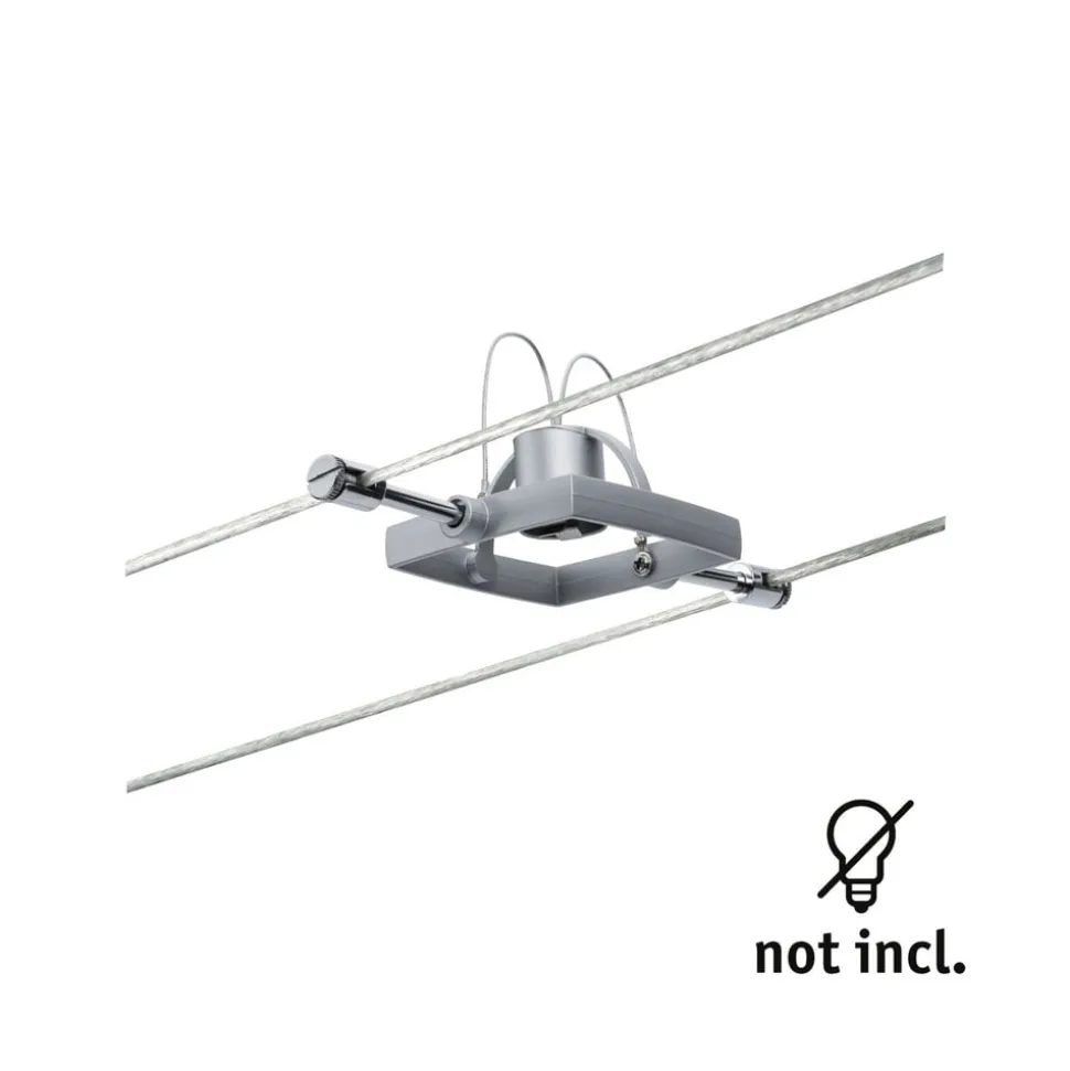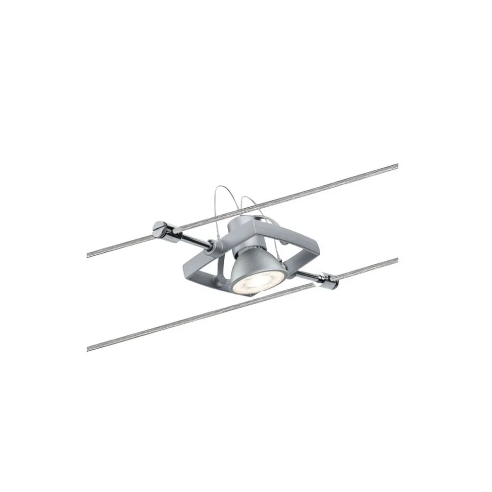 Het kabelsysteem Mac II kan worden uitgebreid met deze unieke lamp. De spot is vierkant en gemaakt van metaal en kunststof. Het oppervlak heeft een matte chroomafwerking. De lamp moet uitgerust zijn met een geschikte lichtbron die de ruimte afzonderlijk kan verlichten door de schijnwerper te kantelen.