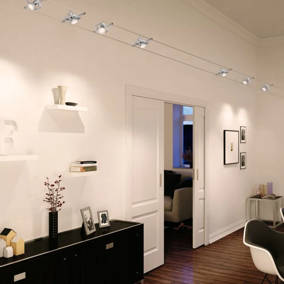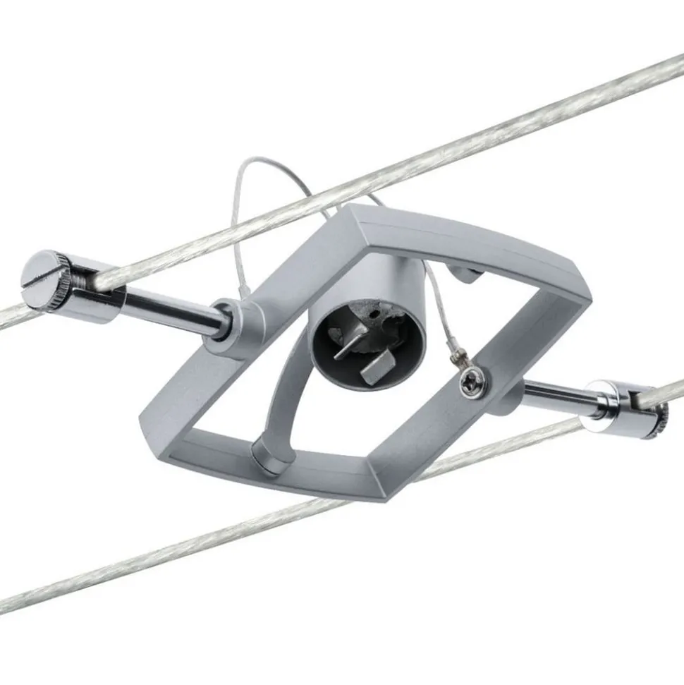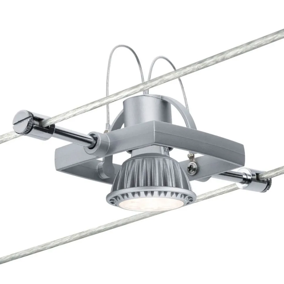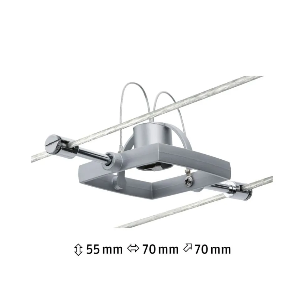 Het kabelsysteem Mac II kan worden uitgebreid met deze unieke lamp. De spot is vierkant en gemaakt van metaal en kunststof. Het oppervlak heeft een matte chroomafwerking. De lamp moet uitgerust zijn met een geschikte lichtbron die de ruimte afzonderlijk kan verlichten door de schijnwerper te kantelen.