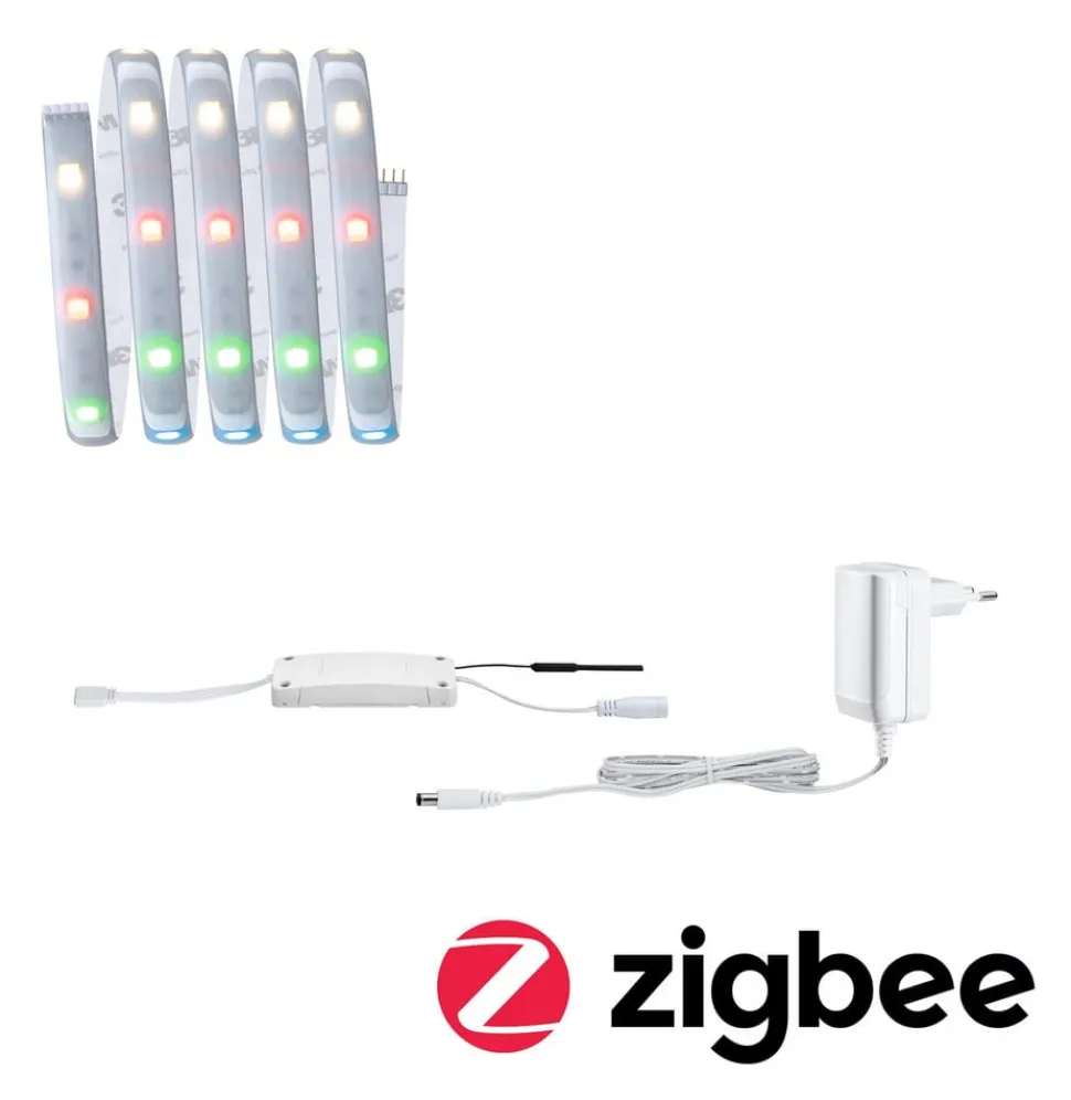 Dimbare MaxLED 250 LED-strip in basisset met ZigBee-compatibele dim-/schakelcontroller en voedingseenheid, RGBW-kleurwisseling Alles wat nodig is voor integratie in een smart home-systeem is al inbegrepen in de basisset van de MaxLED 250 RGBW LED-strip. Zowel de voeding als de connectiviteit zijn geregeld, want naast de LED-strip zijn een voedingseenheid en een op ZigBee gebaseerde dim- en schakelcontroller opgenomen in deze praktische set. Dankzij plug-in aansluitingen is de installatie snel en MaxLed is bovendien beschermd tegen spatwater. Er is een aparte brug nodig om de helderheid te dimmen en de lichtkleur aan te passen. De smik gateway van Paulmann, die apart verkrijgbaar is als accessoire, biedt een gratis app voor Android en iOS. Hij kan ook worden gekoppeld aan Amazon Alexa om alles via spraakopdrachten te bedienen. Maar integratie in een bestaand ZigBee-geschikt smart home-systeem van andere fabrikanten is ook mogelijk. Met de Gent-afstandsbediening of de 2-voudige wandschakelaar van Paulmann op basis van ZigBee is intelligente lichtregeling weer mogelijk zonder extra brug. Alleen de bediening via de app hoeft in dit geval achterwege te blijven. Deze zogenaamde smart home handzenders zijn ook los verkrijgbaar via de accessoires. Technische kenmerken / compatibiliteit: – Complete set incl. LED-strip en voedingseenheid – Uitbreidbaar (zie accessoires) – ZigBee 3.0 compatibel – compatibel met Paulmann Smart Home afstandsbediening en wandschakelaar (zie accessoires) – compatibel met Smart Home systemen op basis van ZigBee zoals Philips Hue of IKEA Tradfri – dimbaar en lichtkleur instelbaar (na integratie in een Smart Home systeem) – zelfklevend aan de achterkant, plug-in systeem voor eenvoudige installatie en kan naar wens worden ingekort – flexibel materiaal voor gebruik op vlakke of gebogen oppervlakken Opmerking: voor gebruik van de intelligente lichtregeling (dimmen, kleurverandering, bediening via app etc.) is een aparte ZigBee zender nodig.) is een aparte ZigBee bridge of een ZigBee handzender absoluut noodzakelijk (zie accessoires)