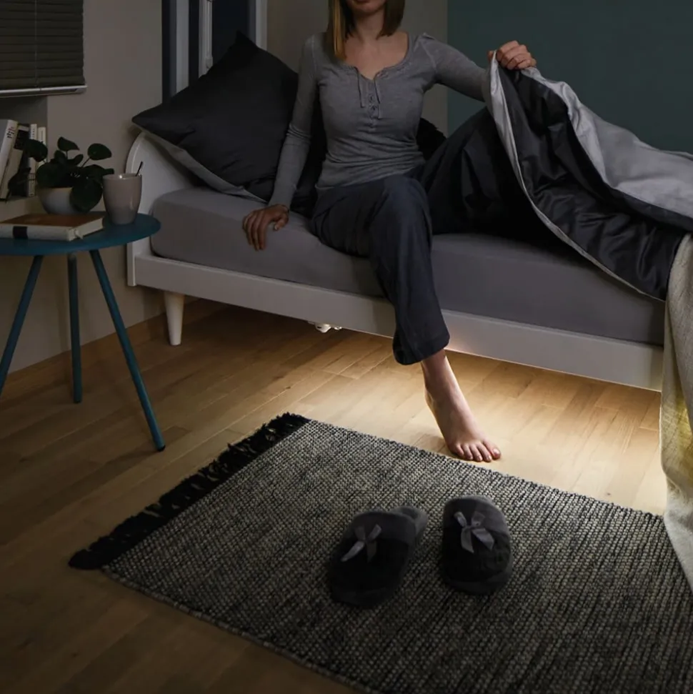 De MaxLED 250 Nacht Comfort Set voor een eenpersoonsbed brengt veiligheid in de slaapkamer en schakelt automatisch in als je ’s nachts opstaat. De streep en de sensor zitten gewoon onder de zijkant van het bed. Een schemersensor schakelt het licht pas in als het donker wordt, zodat onbedoeld inschakelen overdag wordt voorkomen. De lichtduur kan handmatig worden ingesteld tussen 30 seconden en 6 minuten.