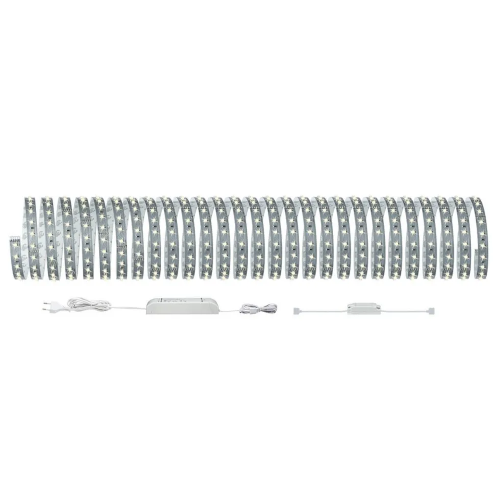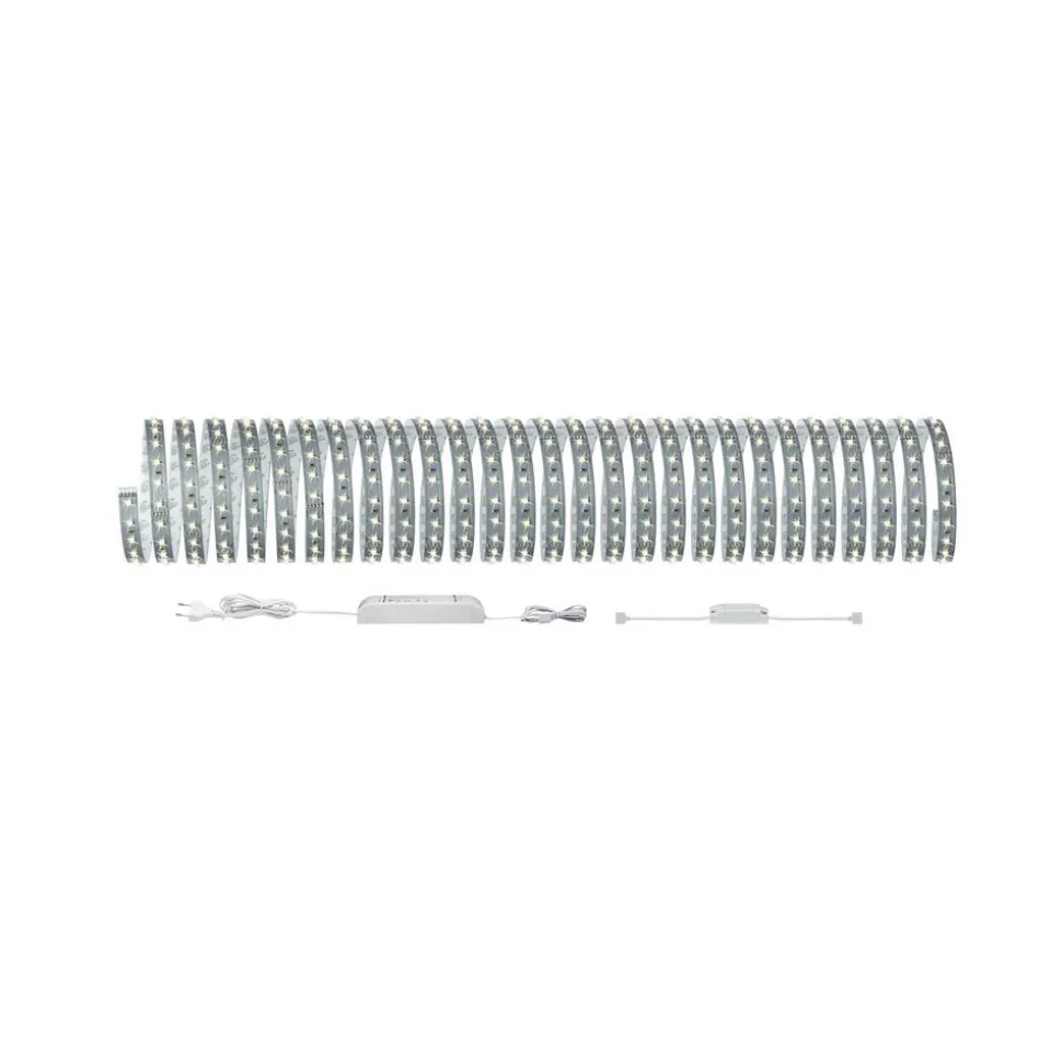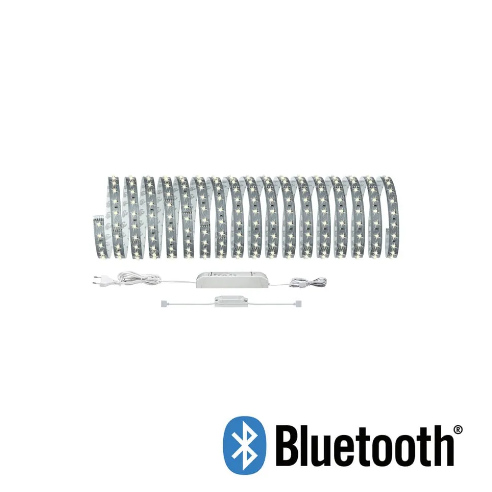 Het complete MaxLED-Strip pakket dat bij uitstek geschikt is voor ruimteverlichting, bijvoorbeeld gemonteerd in profielen. Naast het voorschakelapparaat, de 10 m LED-strip en de stekkeraansluitingen wordt ook een dim-/schakelcontroller meegeleverd, waarmee de strip via Bluetooth kan worden geschakeld. Zo kan de strip comfortabel vanaf de bank of het bed worden geschakeld en gedimd met behulp van de gratis Paulmann Home app en een smartphone of tablet.
