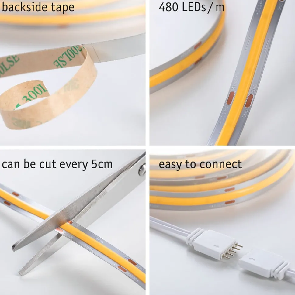 Dankzij de COB LEDs straalt de MaxLED 500 COB LED strip een homogeen werklicht uit zonder zichtbare lichtpunten. Zoals alle MaxLED-strips is hij voorzien van een 5-pins adapter voor gemakkelijke aansluiting en kan hij met 2,5 m worden verlengd en om de 5 cm worden ingekort. De strip heeft ook een hoge lichtopbrengst.
