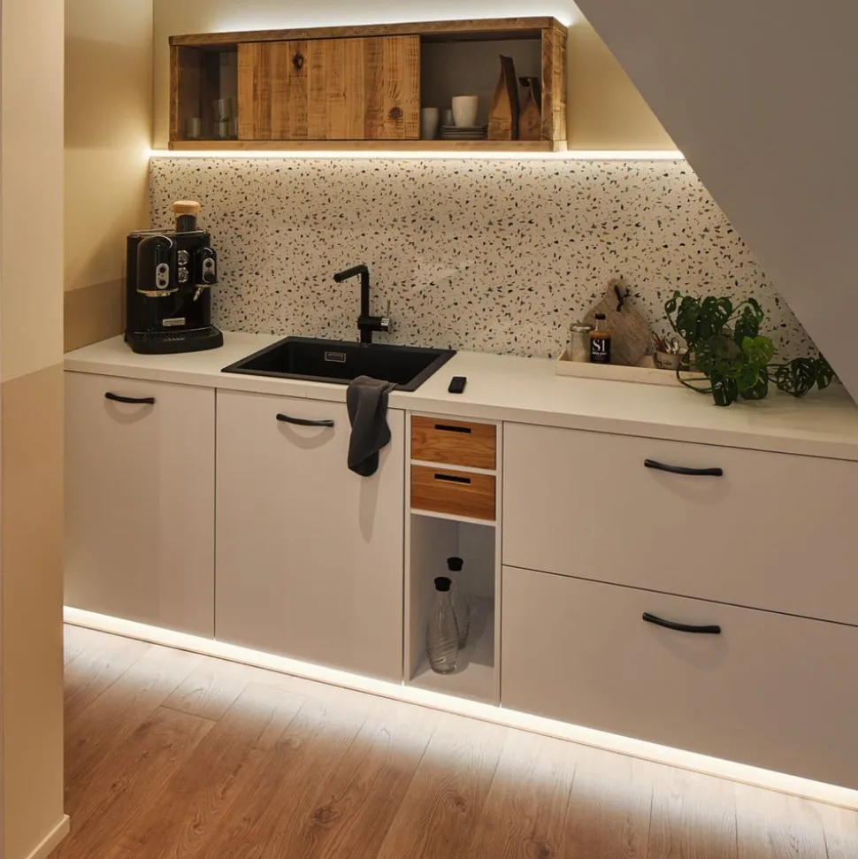 Deze LED-strip kan alleen worden gebruikt in combinatie met de MaxLED 500 basisstrip uit de serie. Hij is uitgerust met krachtige LED’s die het mogelijk maken de strip niet alleen als decoratieve verlichting, maar ook als hoofdverlichting te gebruiken. De strook kan met 41,5 cm worden ingekort en zo aan de omstandigheden in de kamer worden aangepast. De speciale coating die de LED’s beschermt tegen stof en spatwater maakt de strip ook een lichtbron die in vochtige ruimtes kan worden gebruikt. Installatie is kinderspel dankzij de zelfklevende achterkant.