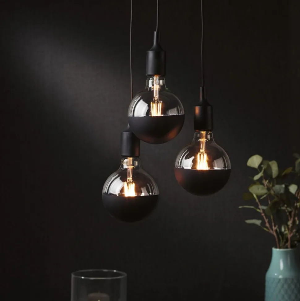 Moderne drielamps pendelarmatuur Neordic Ketil in zwartDeze zeer eenvoudige pendelarmatuur overtuigt door zijn heldere vorm en tijdloze uitstraling, die in tal van woonstijlen kan worden geïntegreerd. Er zijn geen details, dus het heeft geen kap, maar slechts drie stopcontacten die elk aan een siliconen kabel aan de ronde kap hangen. Door de juiste lichtbron te kiezen, kan de hanglamp een decoratief accent krijgen. Gloeilampen zijn geschikt, evenals speciale kopspiegellampen – Levering zonder lampen, alleen kap, kabel en stopcontacten