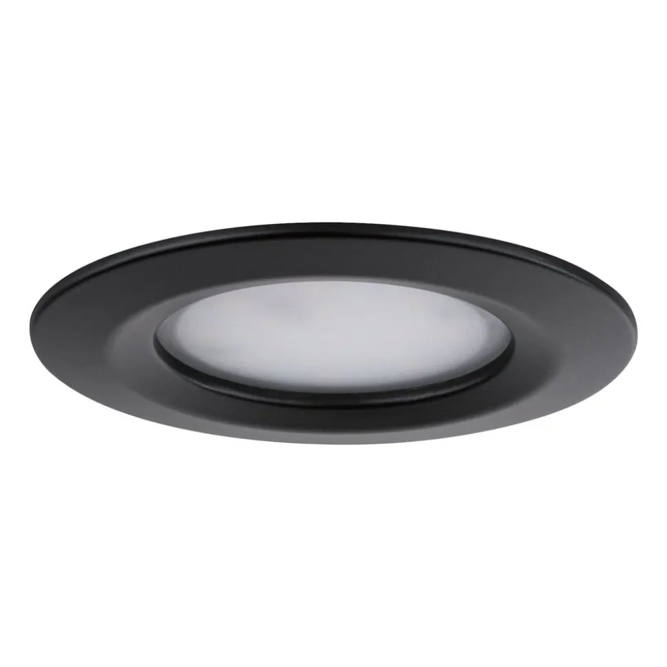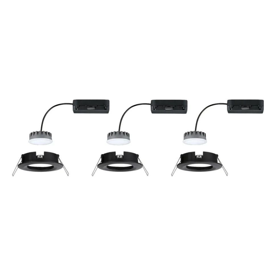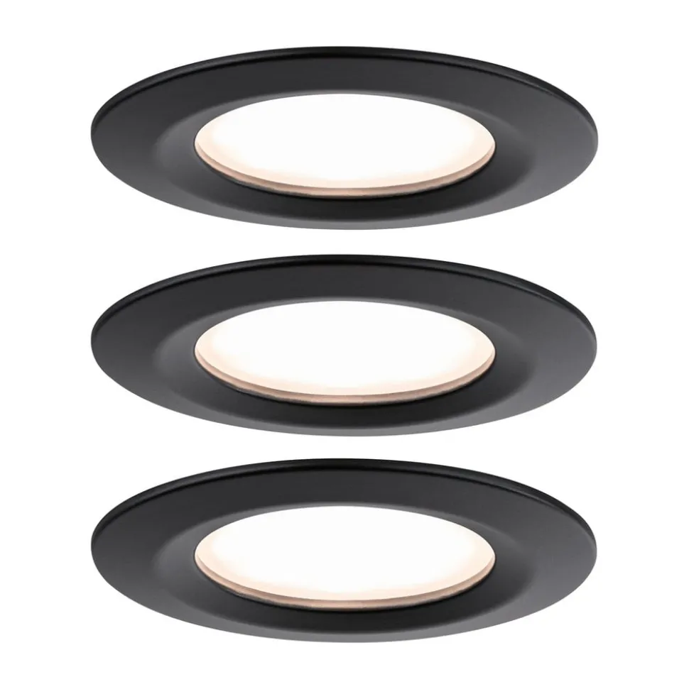 Deze set van 3 LED inbouwarmaturen Nova Plus Coin van Paulmann is geschikt voor nieuwe installaties of voor het vervangen van bestaande installaties en dankzij de IP44-beschermingsgraad ook geschikt voor badkamers of andere vochtige ruimtes. De inbouwarmaturen kunnen zonder gereedschap aan elkaar worden gekoppeld met behulp van snelklemmen en kunnen ook worden gedimd met een externe dimmer (niet inbegrepen). De inbouwspots zijn zeer plat en daarom ook geschikt voor ondiepe spouwdiepten van slechts 30 mm. De set bestaat uit drie starre armaturen in zwart met LED-modules.