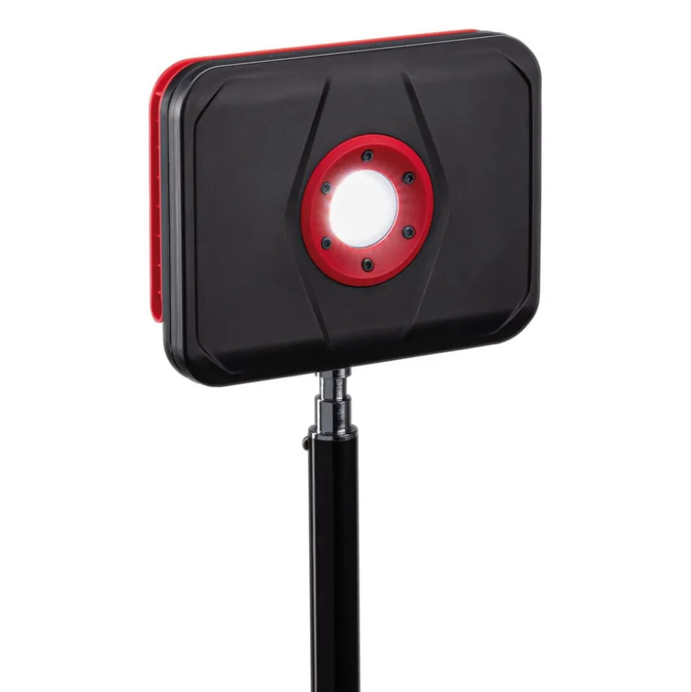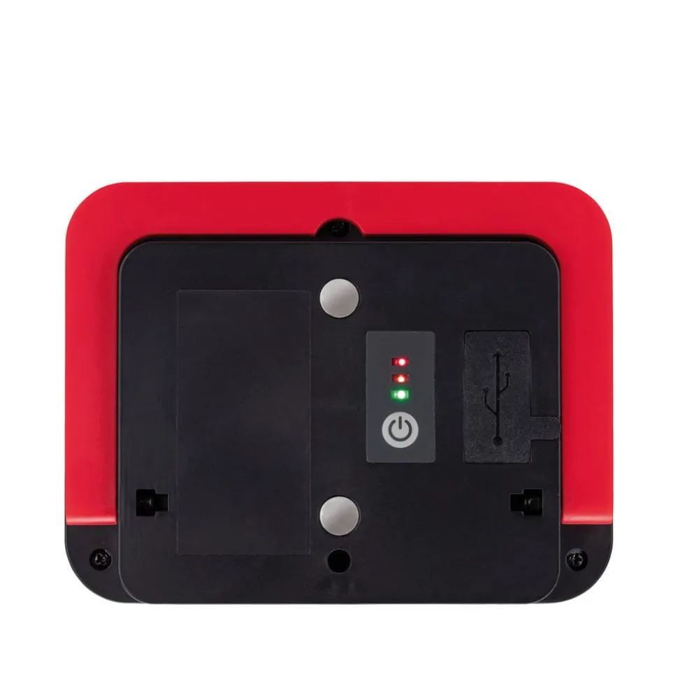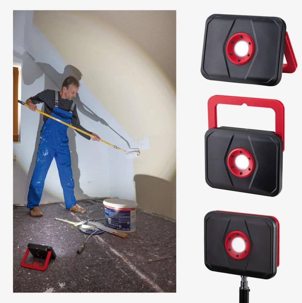 De oplaadbare werklamp Worklight LED is een praktische en functioneel georiënteerde begeleider op de bouwplaats. Het is gemaakt van kunststof en heeft een zwarte en rode kleurencombinatie, waardoor het direct zichtbaar is. Het licht wordt puntsgewijs vanuit het midden uitgestraald onder een stralingshoek van 80°. De werklamp kan worden opgesteld met behulp van de standaard of direct worden opgehangen aan metalen wanden of kappen dankzij de praktische magnetische achterzijde.
