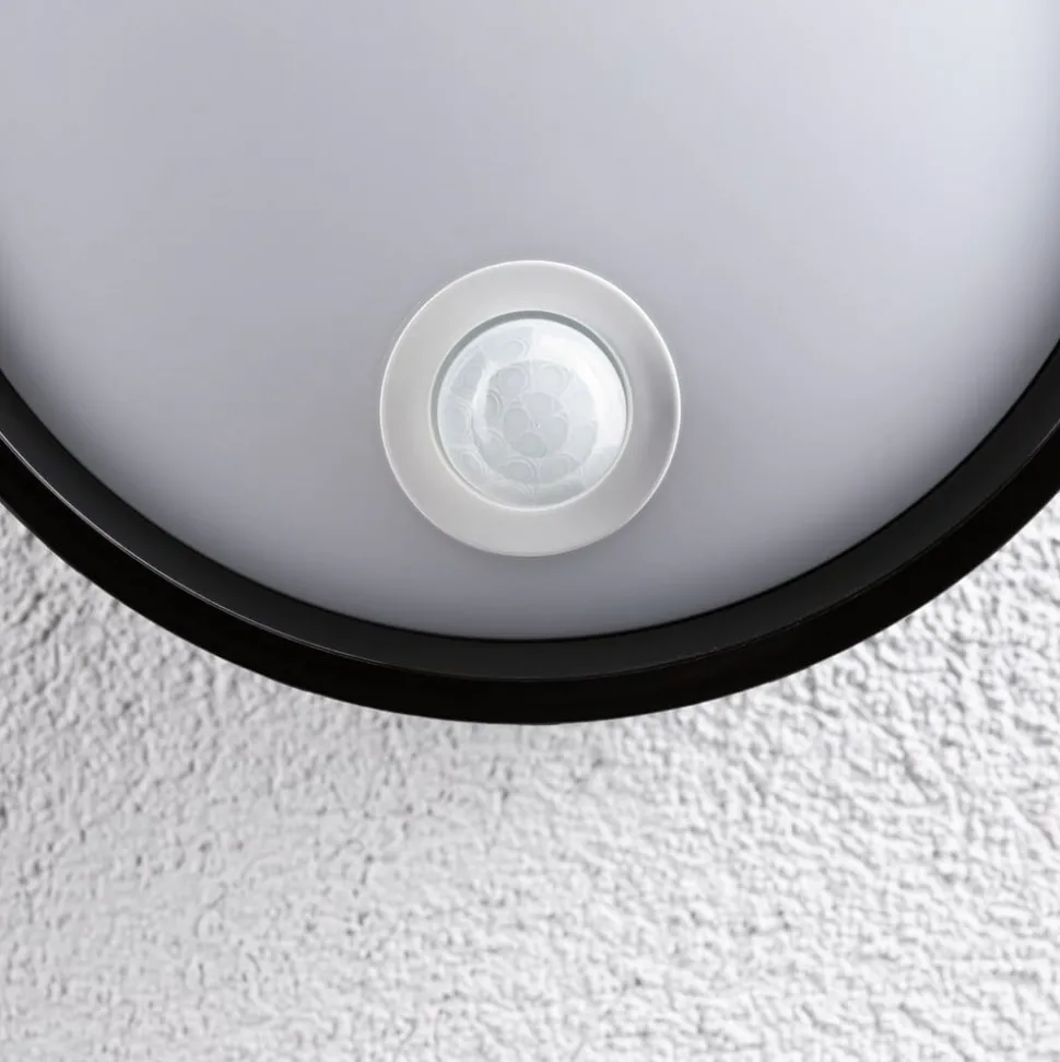 Ronde LED buiten wandlamp met bewegingsmelder Een zwart frame en een diffuser binnenin – de Platomo LED buiten wandlamp is gemaakt van robuust kunststof en is daarom ook geschikt voor installatie in de buurt van de zee. De LED spots achter de matte diffuser verspreiden hun warmwit licht krachtig, gelijkmatig en niet-verblindend en verlichten de ingang of het terras. De inschakeltijd kan worden ingesteld tussen 15 seconden en 4 minuten – Detectiebereik sensor 90°, bereik 4 – 10 meter – Responshelderheid 2 lux