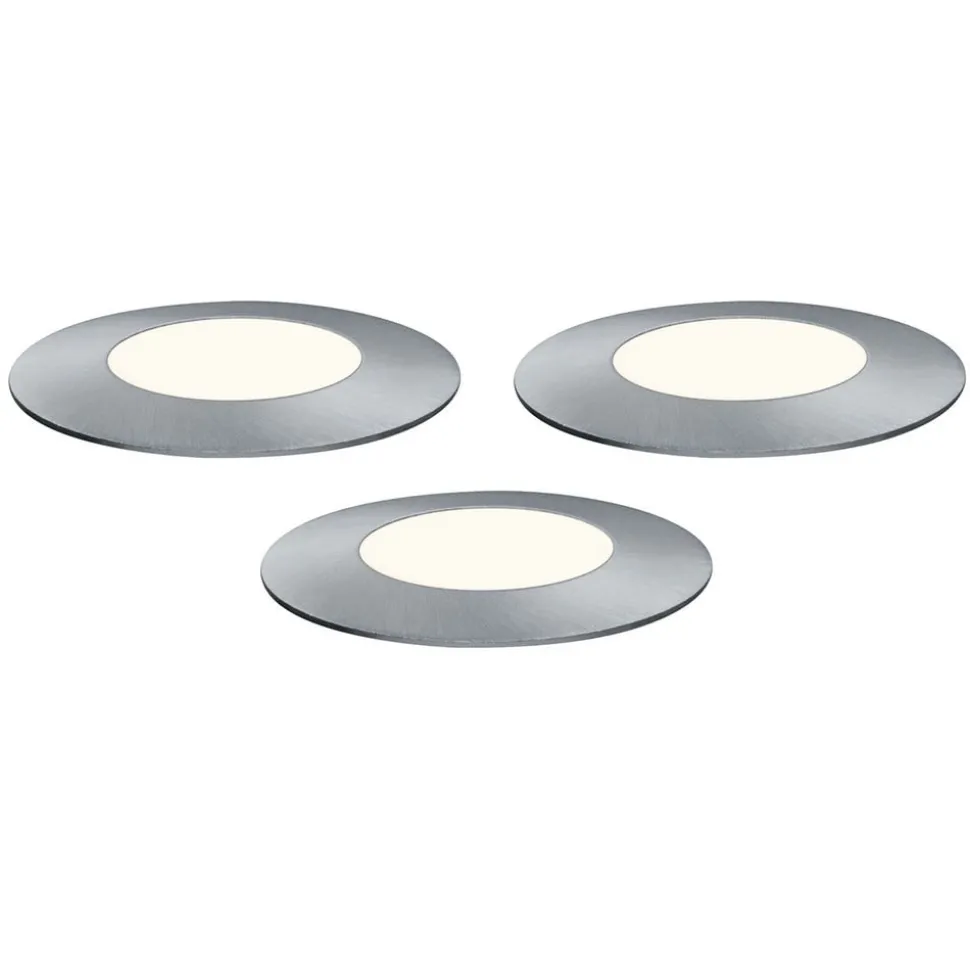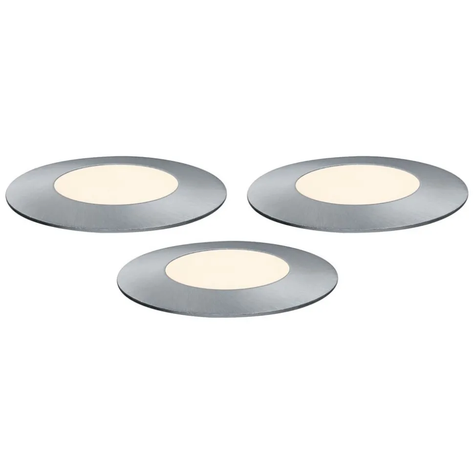 Kleine en ronde grondspot inbouwlamp Plug & Shine Floor Mini, uitbreidingsset met drie lampen Een bestaand Plug & Shine systeem kan worden uitgebreid met deze set voor accent- en oriëntatieverlichting op paden, entrees, veranda’s en tuinen. De set bevat drie Floor Mini LED lampen met een roestvrijstalen frame en matte kunststof afdekking, die worden aangesloten op een bestaande controller, een andere aansluitkabel of een transformator via de aansluitkabel (200 cm, 350 cm, 500 cm, 515 cm uitgangen). Afhankelijk van de locatie is installatie ondergronds of in tussenvloeren (0,3 tot 2 cm) mogelijk – Met een bedrijfsspanning van 24 V en waterdichte kabels, aansluitingen en armaturen is Plug & Shine van Paulmann een veelzijdige en veilige verlichtingsoplossing voor buiten – Leveringsomvang: drie armaturen, drie installatiehulzen, aansluitkabel – Transformator met stekker, extra kabels enz. zijn verkrijgbaar als accessoires zijn verkrijgbaar via de accessoires – Kan altijd worden in- en uitgeschakeld via lichtschakelaar – Voor afstandsbediening is een controller nodig (zie accessoires) – Plug & Shine is geschikt voor integratie in Smart Friends voor bediening via de Smart Friends-app (voor iOS en Android). Hiervoor is een ZigBee nodig (zie accessoires). Plug & Shine kan ook worden geïntegreerd in andere ZigBee-compatibele smart home-systemen (bijv. voor spraakbesturing via Amazon Alexa), waarvoor de betreffende gateway nodig is – max. kabellengte stroombron – armatuur: 50 m – bestand tegen zwembadwater