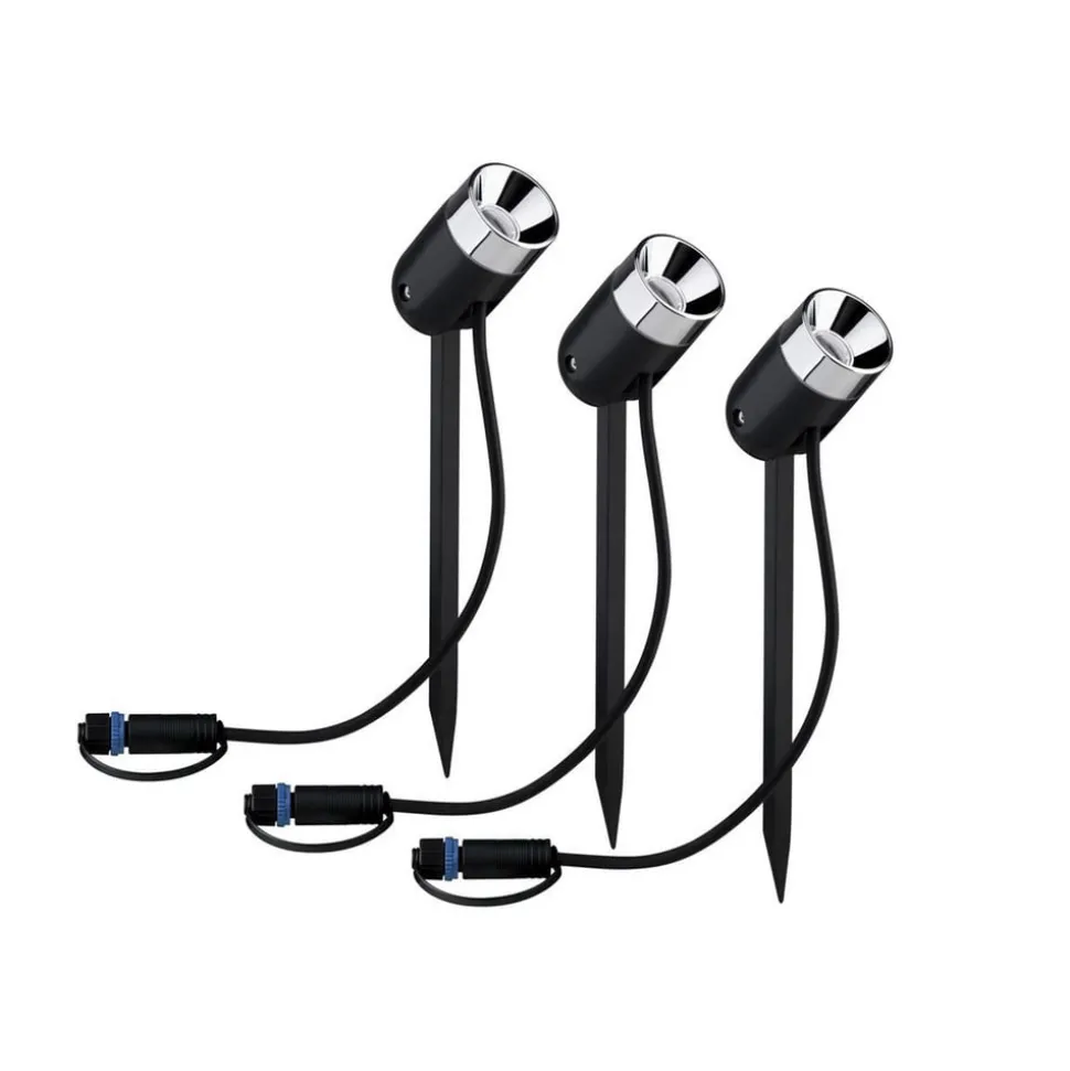 LED grondspies lamp Plug & Shine Pike met chromen details in een basisset van 3 Bedden, bomen, gevels en sculpturen worden speciaal geaccentueerd met het regelbare licht van de Pike grondspies lamp. Maar ook overdag maakt de spot indruk met elegantie dankzij de glanzende chromen afwerking. Alle onderdelen die nodig zijn voor de bediening zijn inbegrepen. De transformatorstekker wordt gebruikt voor de 230V-aansluiting, en dankzij de aansluitkabel met uitgangen op 150 cm, 300 cm, 500 cm en 515 cm kunnen de lampen variabel worden gepositioneerd – Met een bedrijfsspanning van 24 V en waterbestendige kabels, aansluitingen en lampen is Plug & Shine van Paulmann een veelzijdige en veilige verlichtingsoplossing voor buiten.