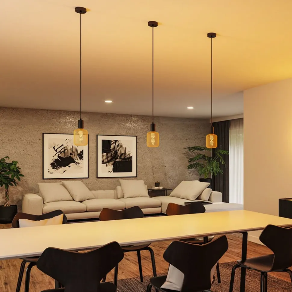 Ravi hanglamp met E27 fitting, zonder kap Die Ravi hanglamp bestaat uit een ronde baldakijn, een met textiel beklede kabel en een cilindrische E27 fitting. In deze fitting kan een lamp van maximaal 60 W worden geschroefd. Het uiterlijk van het armatuur kan worden veranderd afhankelijk van de keuze van de lamp. Die foto’s tonen het armatuur onder andere met lampen uit de Metallic Glow-serie van Paulmann. Deze zijn niet bij de levering inbegrepen, maar kunnen direct worden besteld. ALS enkele lamp, maar ook gemonteerd in een rij of in een Cluster van meerdere lampen, verlicht de lamp tafels of toonbanken in de keuken en woonkamer en is dankzij de beschermingsgraad IP44 ook geschikt voor gebruik in de badkamer.