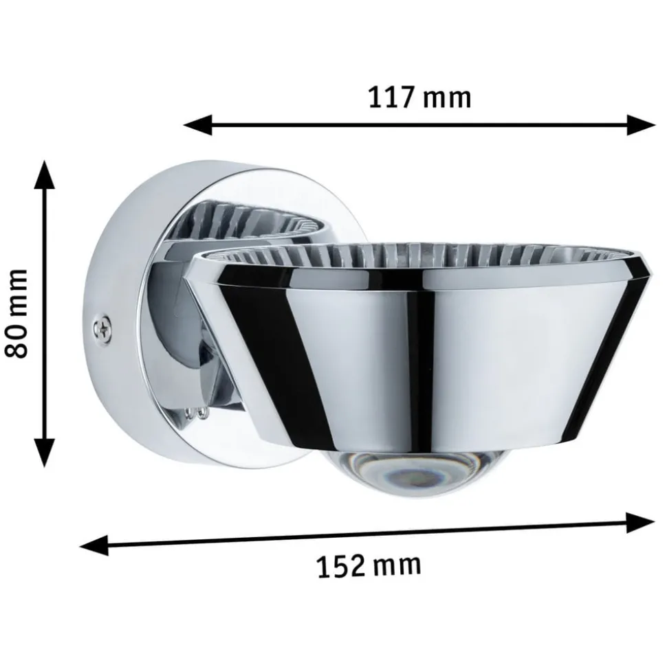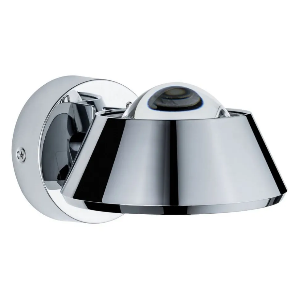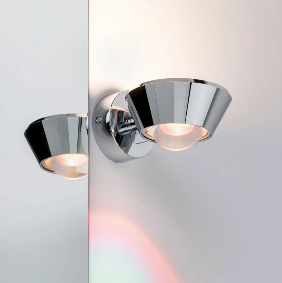 Deze LED-wandlamp is een spotkop met een LED-lichtbron die naar boven en naar benden schijnt. Op de glazen lens kan men met een borgring in het onderste gedeelte een dichroïsche folie (inclusief) aanbrengen, die voor speciale lichtaccenten zorgt. De spot kan 180° worden gedraaid, zodat er een indirecte verlichting kan worden gecreëerd door de muur te verlichten. Dankzij IP44-spatbescherming kan deze lamp ook gemakkelijk in de badkamer worden geïnstalleerd.