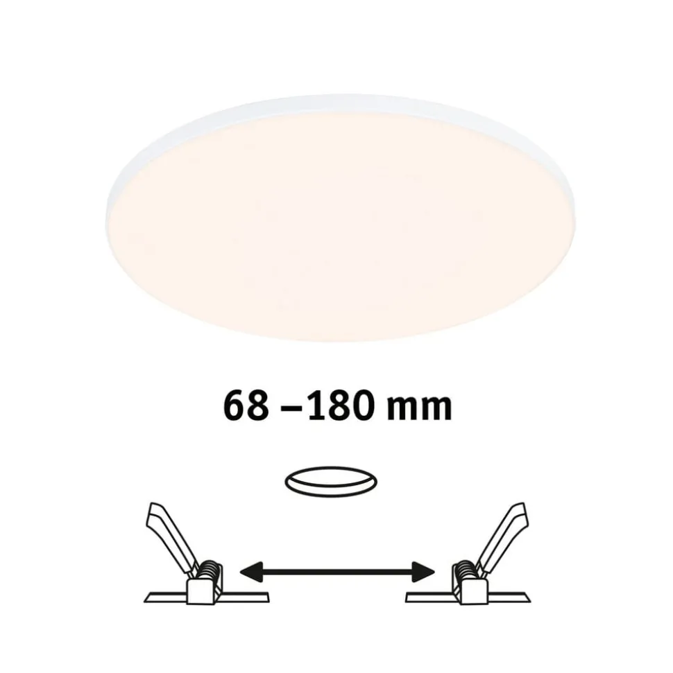 Dimbare LED inbouwlamp Veluna Edge IP44 in ronde vorm, 3.000 K Veluna VariFit Edge is een dimbaar LED inbouwpaneel met warmwitte LED’s, dat dankzij de spatbescherming ook geschikt is voor badkamers en vele andere ruimtes. Die helderheid kan worden geregeld via een externe dimmer (dimmer C voor elektrische transformatoren). Dankzij de VariFit-technologie met verstelbare klemveren kan de lamp in inbouwopeningen van verschillende Gross geïnstalleerd worden. Die platte vorm maakt installatie in ondiepe spouwdieptes mogelijk. Het frameloze LED paneel heeft een gesatineerde kunststof afdekking die het licht van de LED’s gelijkmatig in de ruimte verspreidt – Geschikt voor badkamers en vochtige ruimtes dankzij IP44-bescherming – Hoge lichtopbrengst met licht over een groot oppervlak – VariFit flexibele installatie met verstelbare klemveren – Dimbaar met dimmer C voor elektrische transformatoren
