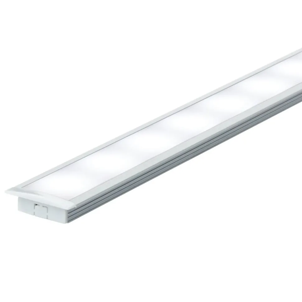 Vloerinbouwprofiel voor MaxLED of YourLED LED strip Dit aluminium inbouwprofiel met een afdekking van gesatineerde kunststof kan worden voorzien van een MaxLED LED strip in elke lichtkleur en maakt een decoratieve en veilige verlichting van vloeren of meubels mogelijk. De strip wordt eenvoudig in vloerbedekkingen gelijmd vanaf een dikte van 8 mm of ingefreesd in meubels vanaf een materiaaldikte van 1,2 cm. Das kan op elke gewenste lengte worden gesneden. Als decoratieve rand of visuele ruimteverdeler – in combinatie met dit installatieprofiel kunnen de LED strip voor de meest uiteenlopende toepassingen worden gebruikt – Profiel kan naar wens worden ingekort – Beloopbaar tot max. 130 kg – Inclusief eindkappen en steunvlak – Compatibel met YourLED en MaxLED