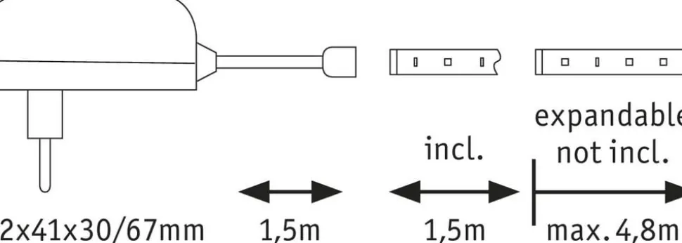 De set bestaat uit 1,5 m YourLED strips, een 230/12 V voeding met kabel en stekker en een 4-polige stekker voor het eenvoudig aansluiten van de strips. De strips zijn gemaakt van wit plastic en hebben een transparante coating op de LED’s om ze te beschermen tegen vocht of contact. Het flexibele materiaal maakt het mogelijk om zowel op vlakke als op gebogen oppervlakken aan te brengen. De stroken kunnen bij de gemarkeerde markeringen worden ingekort en verlengd tot een totale lengte van 4,8 m. Door de zelfklevende achterzijde en het geïnstalleerde insteeksysteem zijn de YourLED strips eenvoudig te bevestigen.