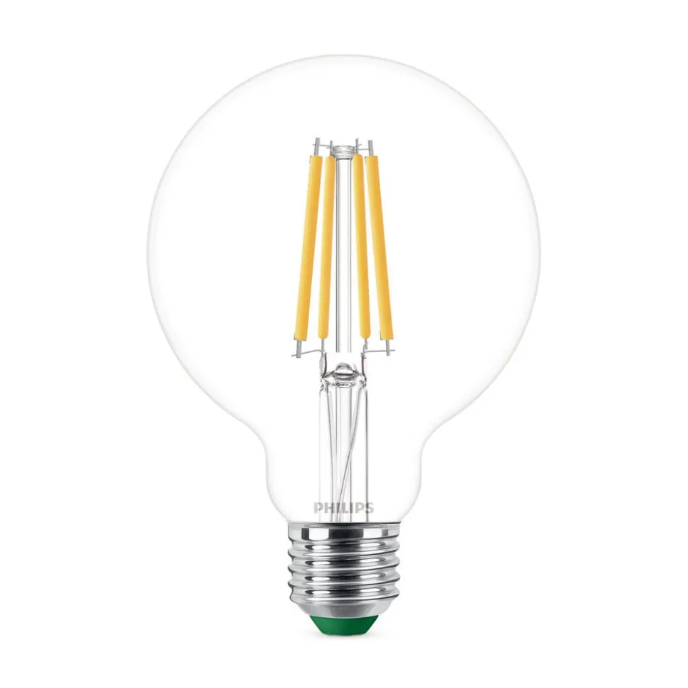 E27 LED gloeilamp G95 met heldere glazen bol en 4 W, 840 lm, 2.700 K Deze heldere 4 W E27 LED gloeilamp in bolvorm met een diameter van 9,5 cm geeft warm wit licht en dient als langdurige, energiezuinige vervanging voor conventionele gloeilampen van 60 W. Niet dimbaar. Ultra-efficiënt – uitstekend lichtrendement met 210 lm/W.