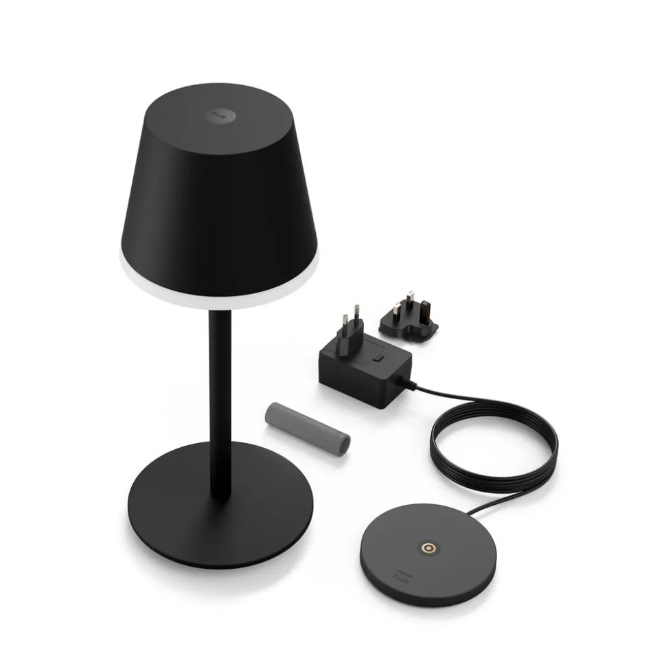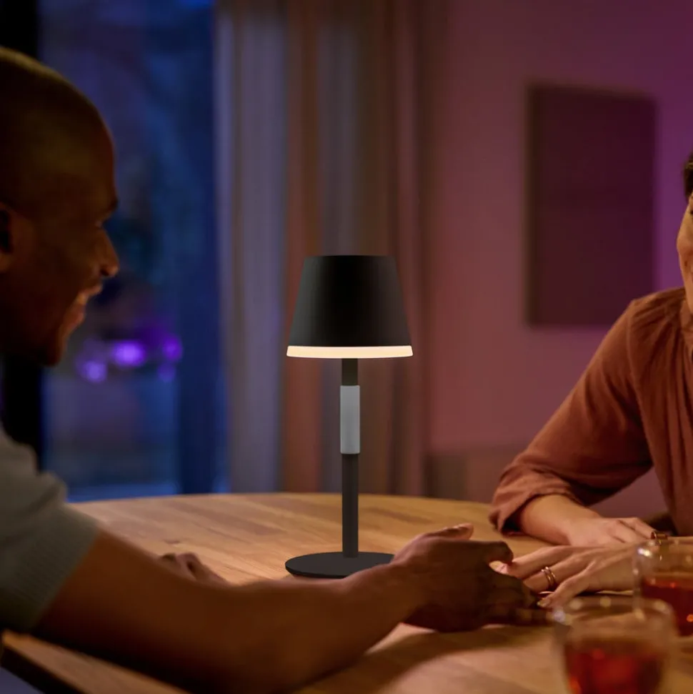 Philips Hue White and Color Ambiance Go tafellamp met oplaadbare batterij – voor binnen en buitenDe draagbare tafellamp Go is uitgerust met functioneel LED-licht dat dankzij de app-besturing tal van mogelijkheden biedt.Hij heeft een RGBW-kleurwisselfunctie waarmee hij voor sfeervolle en kleurrijke accenten kan zorgen. Bovendien kan het licht worden gedimd en kan de kleurtemperatuur worden gevarieerd van warm tot daglichtwit. Dankzij de beschermingsgraad IP54 is de tafellamp optimaal beschermd en kan daarom ook thuis op het terras, het balkon of de tuin worden gebruikt voor sfeervolle accentverlichting. Dankzij de ingebouwde oplaadbare batterij kan de lamp bovendien variabel worden gebruikt, ook op plaatsen waar geen stroomvoorziening is. Hij kan achteraf worden opgeladen via de meegeleverde kabel en het laadstation (IP20) Laadtijd batterij: 3-4 uur- Batterijduur: 6-48 uur (afhankelijk van de gebruikte instellingen)Eigenschappen / compatibiliteit- Dimbaar, 16 miljoen verschillende kleuren en 50.000 verschillende witte tinten- Bedienbaar via ZigBee of Bluetooth en bijbehorende app- Spraakbesturing mogelijk met Amazon Alexa, Apple HomeKit (Siri) en Google Assistant- Naast Philips Hue ook compatibel met andere op ZigBee gebaseerde systemen, zoals Innogy, Bosch, Magenta (Telekom) en Busch-Jäger- Compatibel met Hue Perifo Track systeem- Lichtbesturing via Bluetooth:tot tien lampen en lampen direct bedienbaar met gratis Hue Bluetooth app zonder extra accessoires.Functies: aan, uit, dimmen, vooraf ingestelde lichtscènes Lichtregeling via ZigBee:Integratie via bridge en router in een Smart Home-systeem, zoals Philips Hue (bridge zie accessoires). Hier kunnen veelzijdige functies worden gebruikt, waaronder bediening onderweg, het maken en gebruiken van schema’s en het programmeren van individuele scènes en automatiseringen.