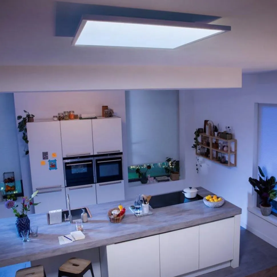 Hoekig Philips Hue LED plafondpaneel Aurelle met White Ambiance functieWarm wit licht om gezellig tv te kijken of krachtig daglicht om geconcentreerd te werken in de keuken – het Philips Hue LED plafondpaneel Aurelle zorgt altijd voor de perfecte sfeer. Het kan niet alleen in verschillende helderheidsniveaus of lichttemperaturen worden geschakeld, maar ook in verschillende modi – via de meegeleverde dimschakelaar, die al vier vooraf geïnstalleerde lichtrecepten heeft, of via een app met de smartphone of tablet. Dankzij het platte ontwerp is het paneel ideaal voor gebruik in ruimtes met een lage plafondhoogte.Eigenschappen / Compatibiliteit- Bediening via Hue-dimschakelaar (meegeleverd)- Bedienbaar met bijpassende Hue-app (ZigBee) en Hue Bluetooth-app- Instelbare kleurtemperaturen: warm wit (2.200 K) tot daglicht (6.500 K)- intelligente lichtregeling Optie a: ZigBee-integratie via bridge en router, zoals de Philips Hue Bridge (zie accessoires); dit maakt bediening lokaal of onderweg mogelijk via de Hue-app en de optie van spraakbediening via Amazon Alexa, Apple HomeKit (Siri) en Google Assistant. – slimme verlichtingsbediening optie b: directe bediening ter plaatse via Bluetooth met gratis Hue Bluetooth app. Bij gebruik van meer dan tien lampen binnen de Bluetooth-bediening wordt het gebruik van een bridge aanbevolen. Opmerking: Niet alle functies zijn beschikbaar bij bediening via de dimschakelaar.