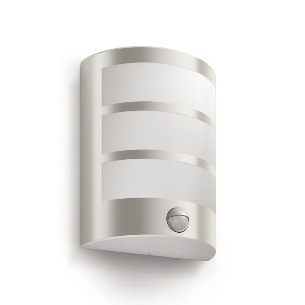 Uitgerust met een bewegingsmelder: Python LED wandlamp voor buiten Python scoort enerzijds met het duurzame roestvrijstalen materiaal en anderzijds met de ingebouwde ultra-efficiënte LED wandlamp van Philips, wat deze wandlamp tot een echt energiebesparingswonder maakt. Python verbruikt minstens 50% minder energie dan vergelijkbare standaard LED lampen van Philips. Bovendien gaat de verlichting alleen aan als de ingebouwde bewegingsmelder beweging detecteert. Technische gegevens van de sensor: Detectiehoek: 110°, afstand: 0-10 m, verlichtingsduur: 5 sec-12 min, daglichtgevoeligheid: 30-200 lux