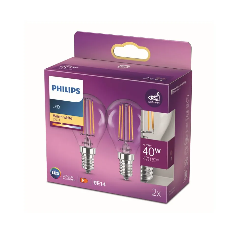 LED gloeilamp E14 in druppelvorm, warm wit met 2.700K, EyeComfort in een dubbelpak