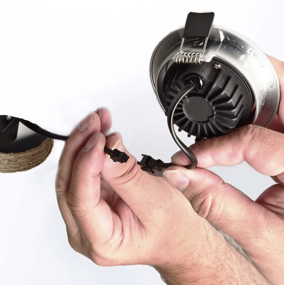 - Voedingsunit – lengte 6,6 cm, breedte 3,5 cm, hoogte 2,0 cm; aansluitdoos – lengte 7,5 cm, breedte 3,9 cm, hoogte 2,3 cm; kabellengte tussen aansluitdoos / voedingsunit / spot: elk ca. 20 cm
