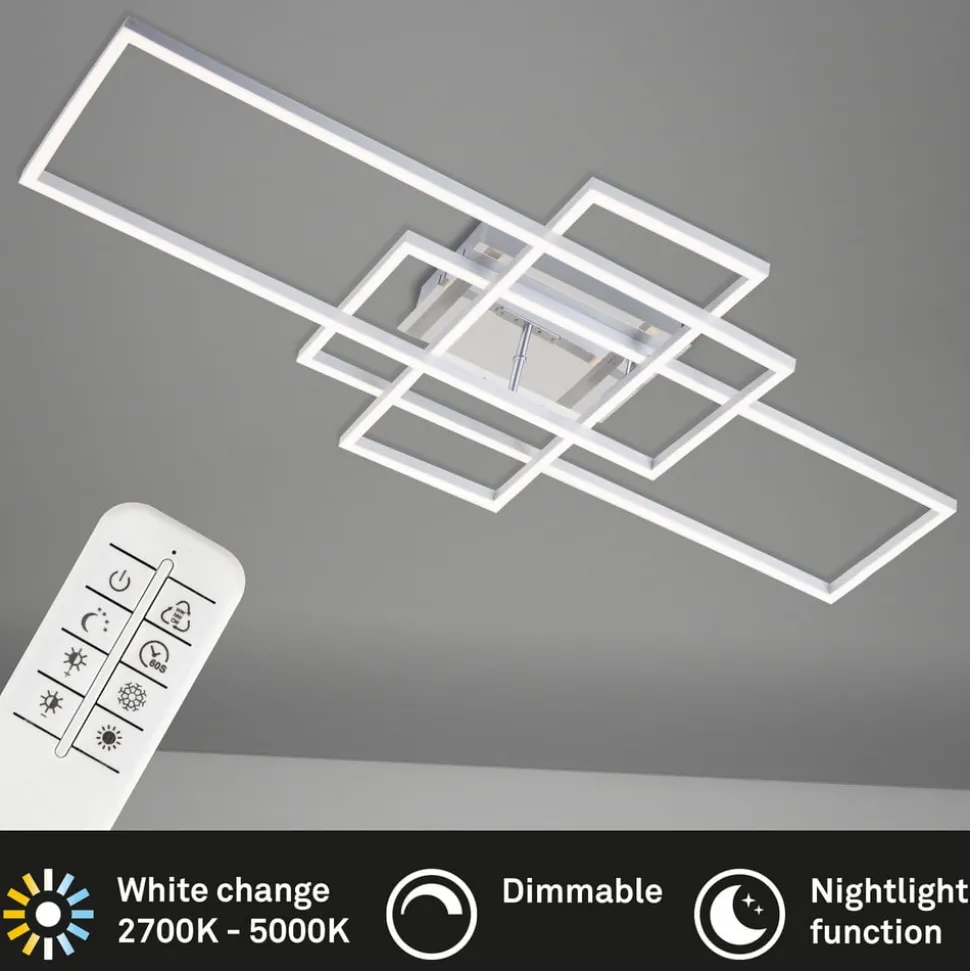 Het bijzondere design van deze LED plafondlamp maakt Frame tot een blikvanger voor moderne interieurs. De drie overlappende rechthoekige metalen frames creëren een geometrische totaalstructuur uit eenvoudige basisvormen. De LED’s zijn geïntegreerd aan de onderkant van de frames achter gesatineerde kunststof en zorgen voor een algemene verlichting van grote oppervlakken.